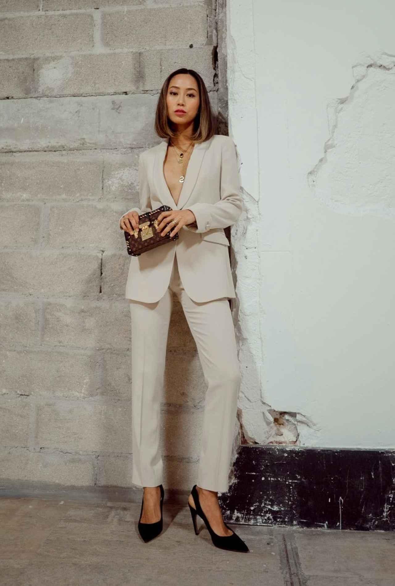 パーティなどでドレスアップしたい時には、思い切ってインナーは着ずにセンシュアルにまとめるのも◎。Armaniのオフホワイトのセットアップを選んだエイミーは、ゴールドのネックレスを重ねて胸元をデコラティブに。クラッチバッグはLousi Vuitton。