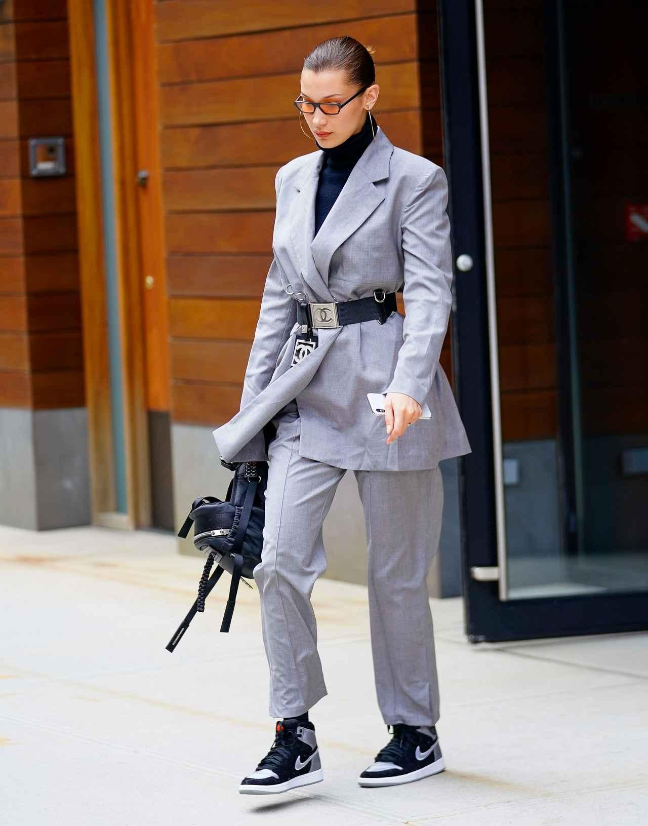 マニッシュな雰囲気漂うグレーのセットアップは、少しオーバーサイズ気味のものを選んだのがベラらしい。そこにChanelの太ベルトを投入し、Nikeのスニーカーやバックパックで見事にストリート調に落とし込んで。