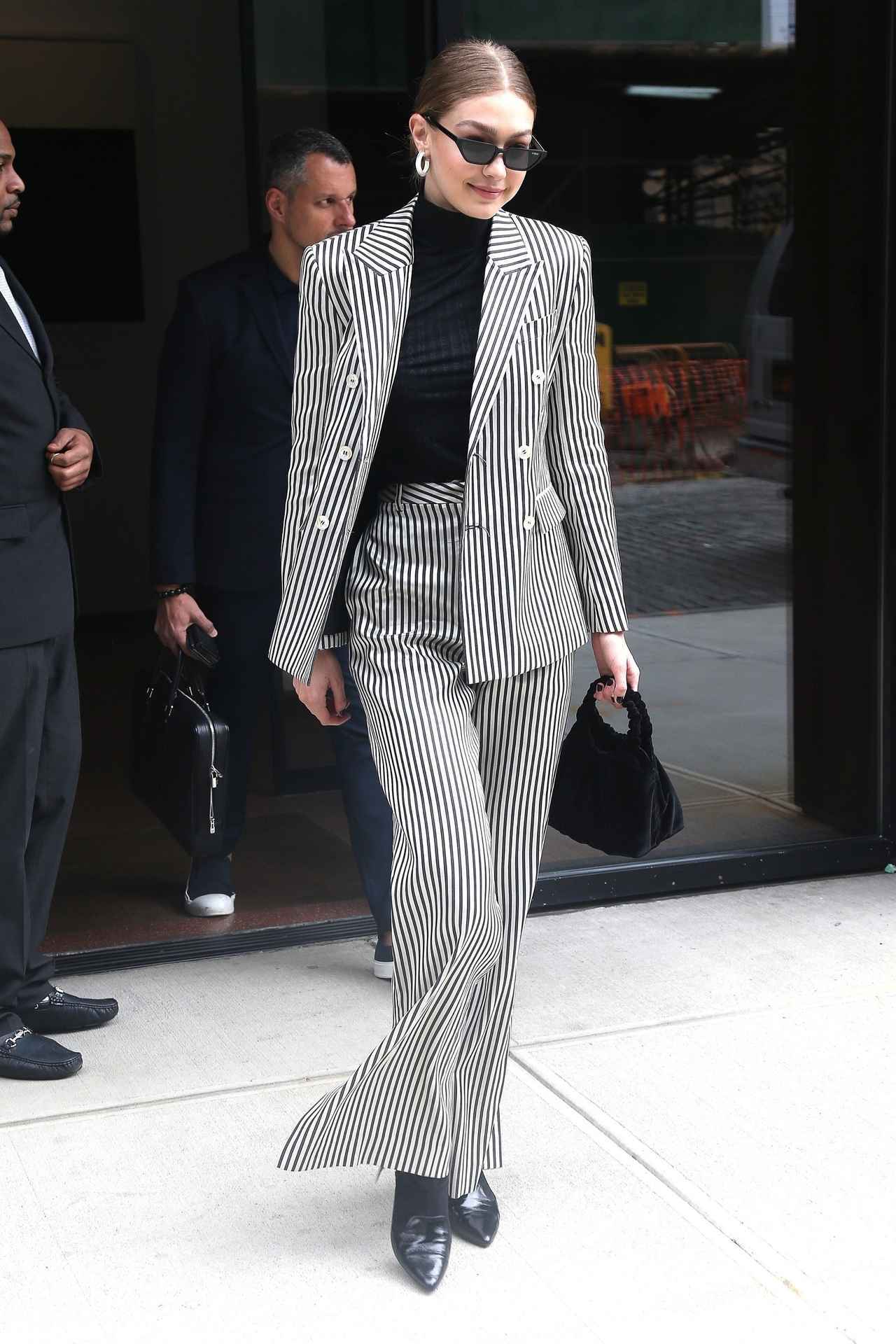 注目ブランドEsauYoriからピンストライプ柄のセットアップを着こなしてスタイルアップを狙って。お気に入りのThe Rowのハンドバッグや、マニッシュなブーツ、中に着たニットは全て黒で統一し、モード感を盛り上げて。