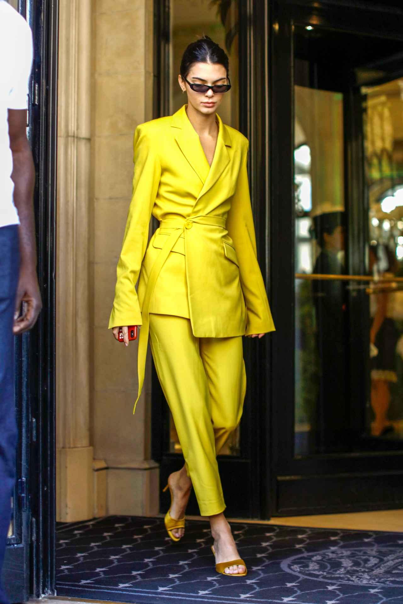 シャイニーな素材感がモードなHouse of Hollandのイエローカラーのスーツでパパラッチの視線を独り占めしたケンダル。ウエスト部分の細ベルトで旬シルエットを作り、Barneysのサテン素材のミュールも同色をチョイス。