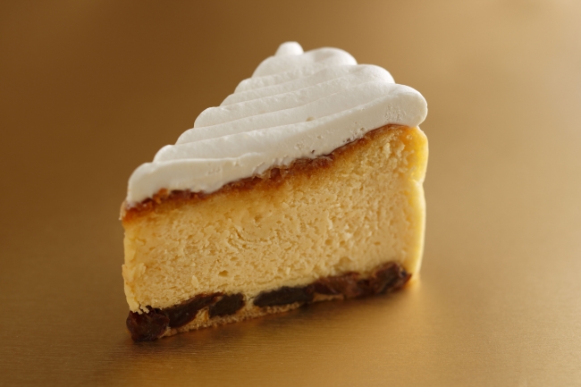 風味豊かな八丈島産のジャージー牛乳でしっとりと焼き上げたこだわりのチーズケーキ。土台には自家製ブレンドのシリアルを混ぜ込んだ特製生地を使用し、底面には大粒のレーズンを3日間かけて丁寧に漬け込んだ自家製ラムレーズンを敷き詰めている。