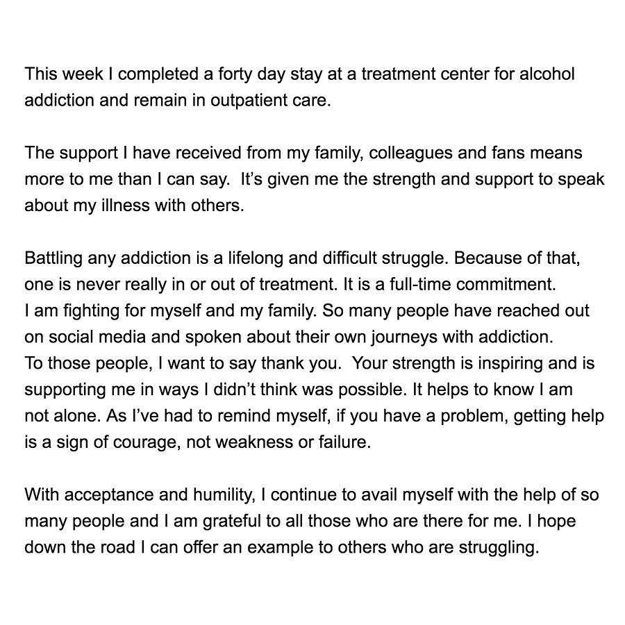 「今週アルコール依存症の治療センターでの40日間の治療が完了し、これからも患者として治療を続けます。