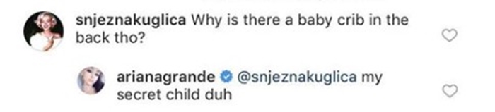 以前、アリアナはピートとの子作りについて「まだ先のこと」と言っていたが、愛し合う2人のあいだにはいつ何が起きてもおかしくはない。そのため、気になったファンがインスタグラムのコメント欄で、アリアナに思い切って「なぜベビーベッドがあるの?」と質問したところ、なんとアリアナ本人から「私の隠し子のためよ。えへ」という衝撃の答えが…。