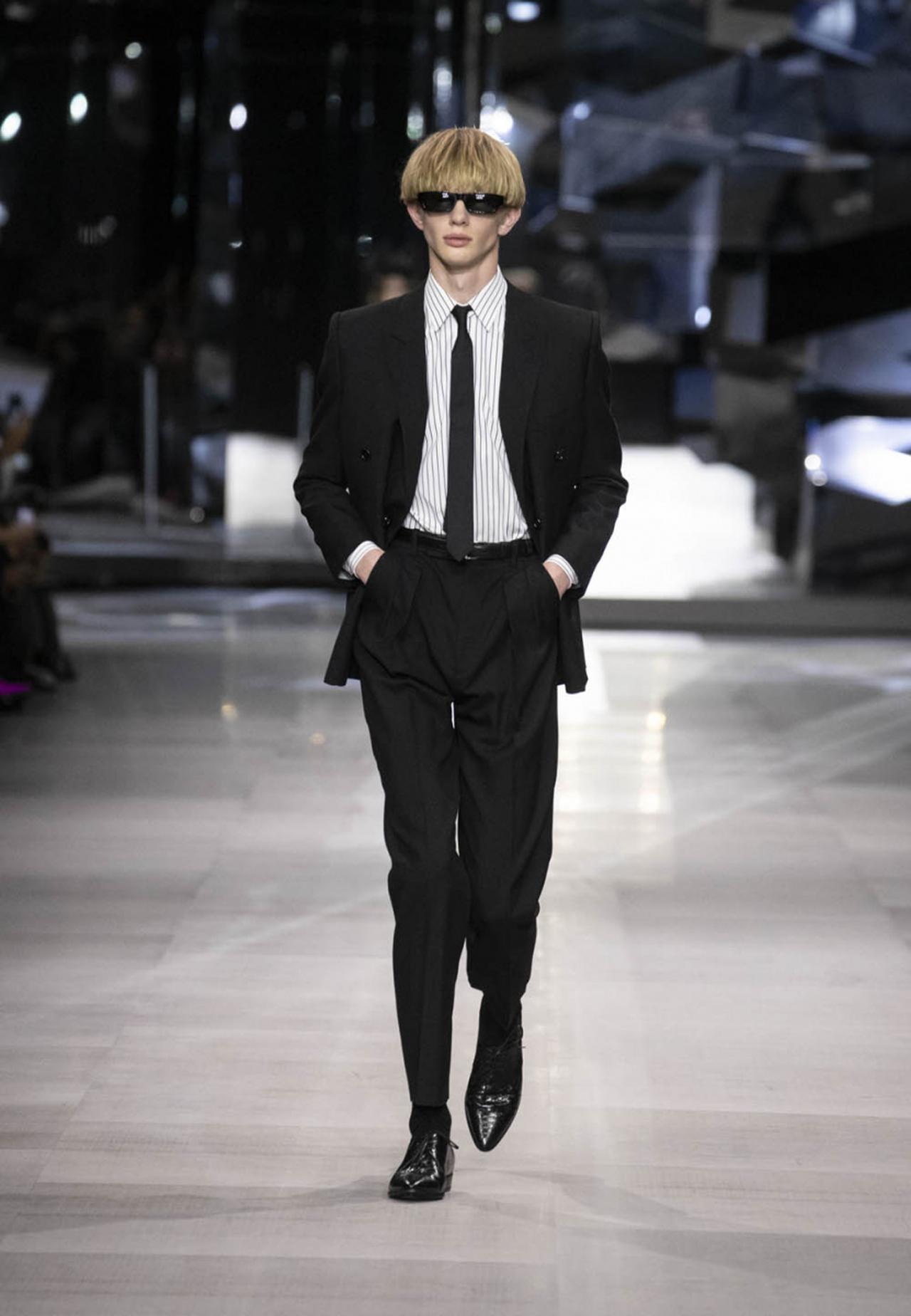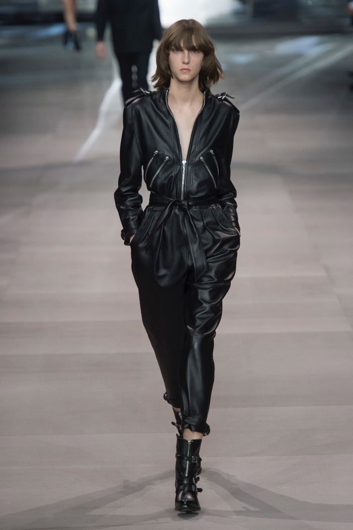 エディの十八番であるスリムなラインに、スキニーサングラスをセットした、どこまでもシャープなルックスが揃う。ランウェイではメンズ、ウィメンズモデルが交互に登場し、これまでのセリーヌのイメージを完全に取り払らい、ブランドの新たな方針を印象付けた。