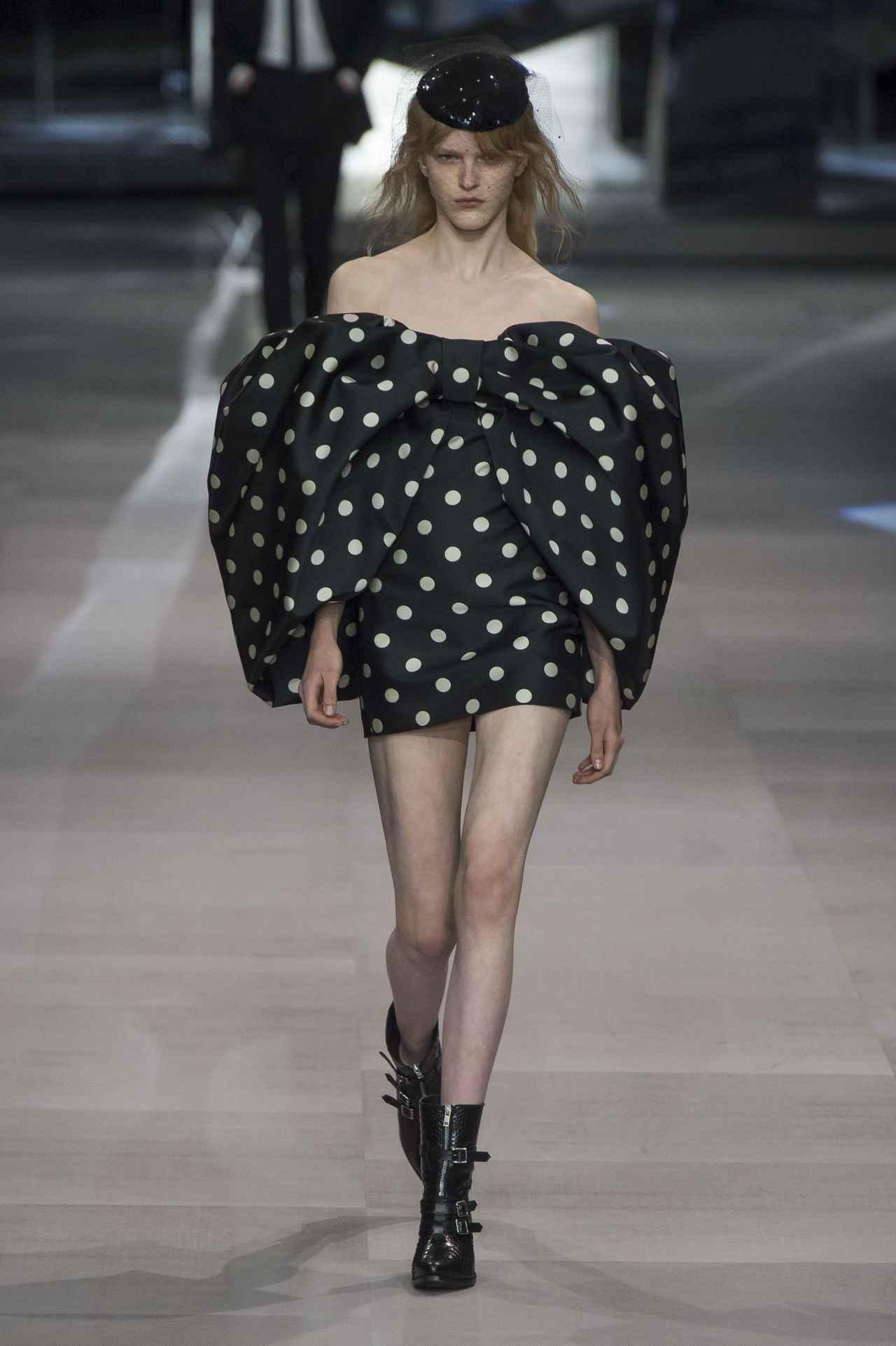 ドットプリントのドレスに、オフショルダーになったビッグリボンがデザインされたファーストルックからショーはスタート。