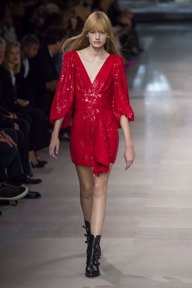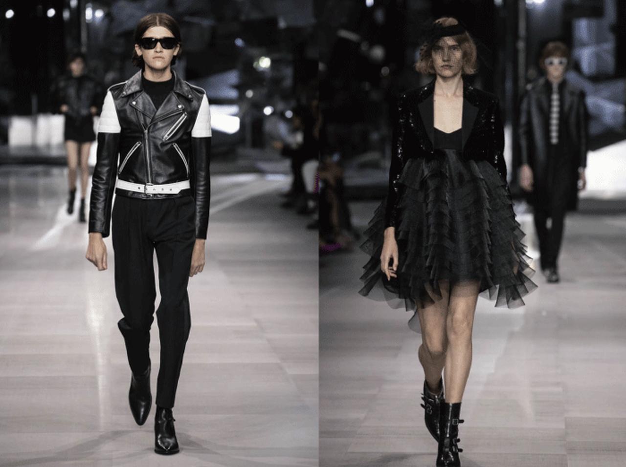 80’のグラムドレスやライダースがモダンに昇華されたルックや、ジェンダーレススタイルの先駆けデザイナーとして有名なエディらしい、マスキュリンなルックの女性モデルが目立つ。