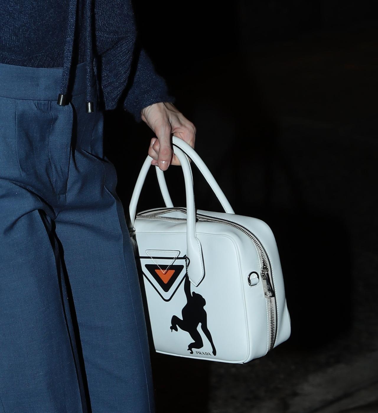 バッグはここ最近ジジが毎日愛用しているPradaのもの。黒いシルエットの猿が描かれたポップで遊び心あるアイテム。(フロントロウ編集部)