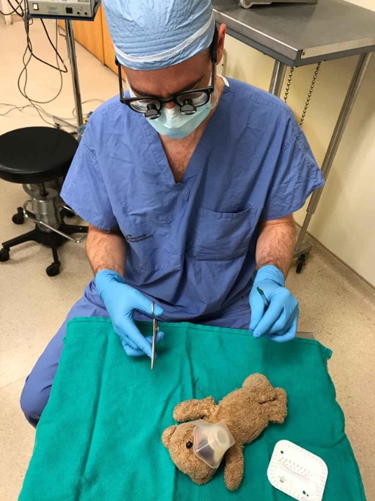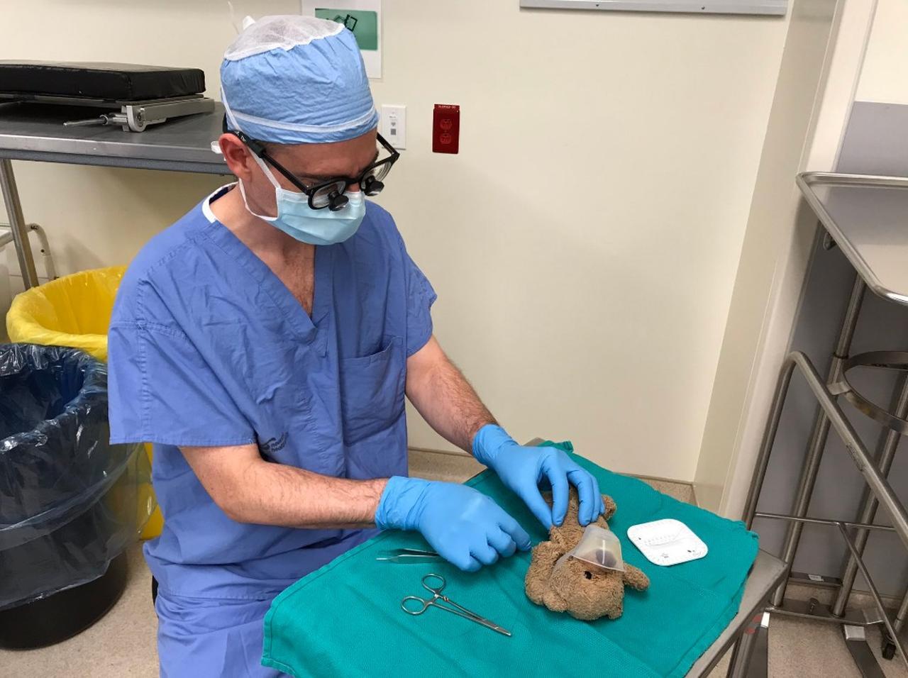 ダニエル医師は手術服のまま、リトルベイビーには呼吸器に見せかけたカップを口元に乗せてあげて、本当の手術さながらの演出でぬいぐるみの手術を決行した。