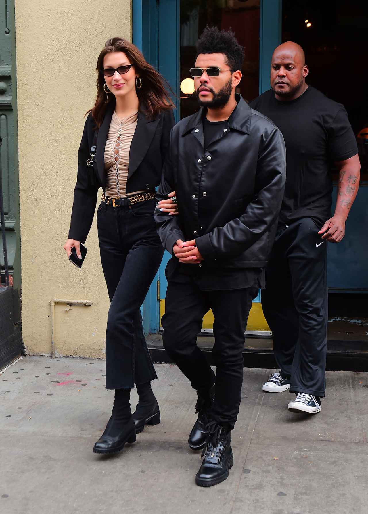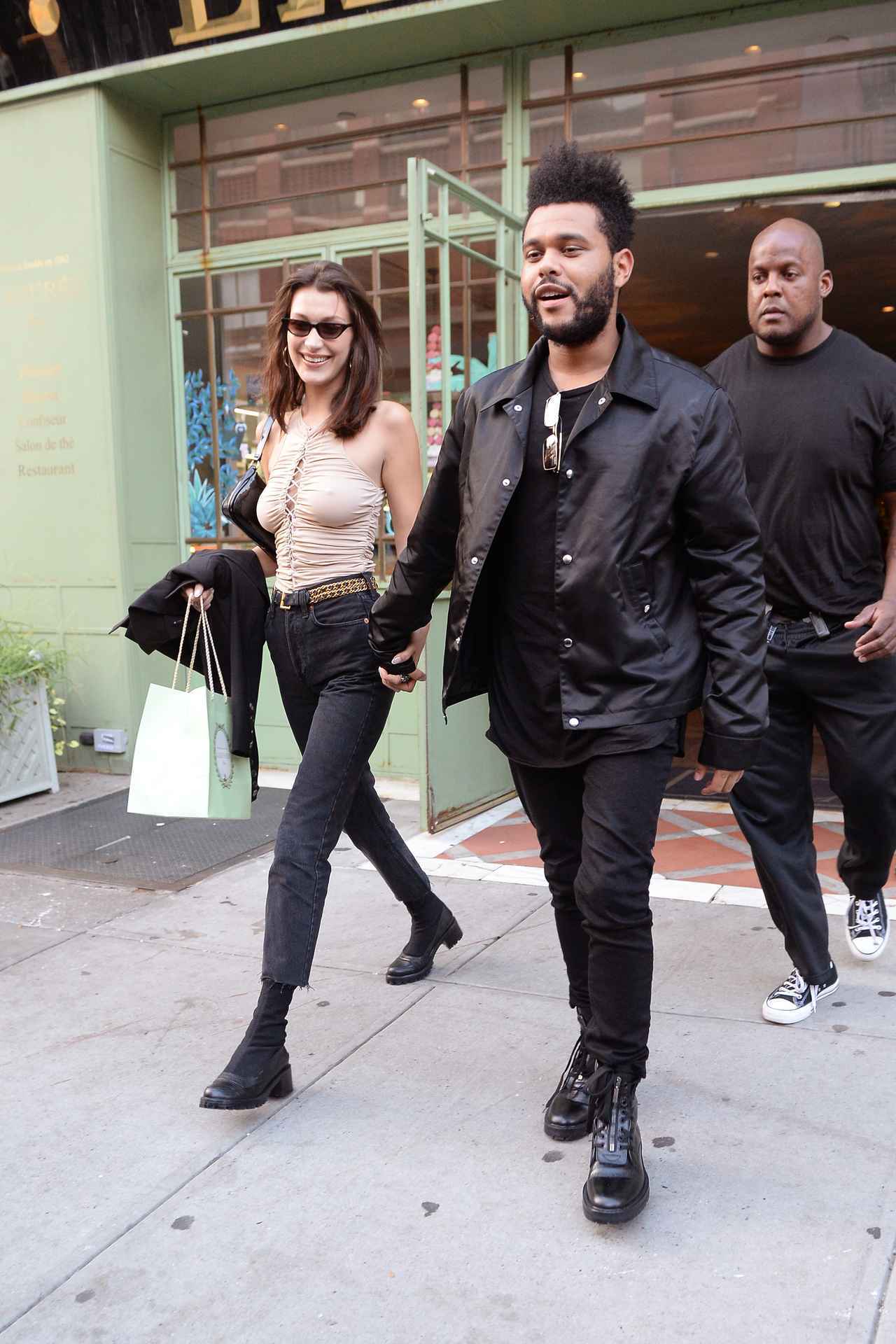 手をつないで笑顔でお店から出てくるベラとザ・ウィークエンド。