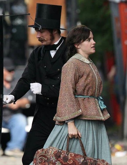 時代が19世紀後半ということもあり、時代を感じるワンピースとジャケットに身を包んだエマは、大きなバッグを持って馬車から降りてくるというシーンを撮影。