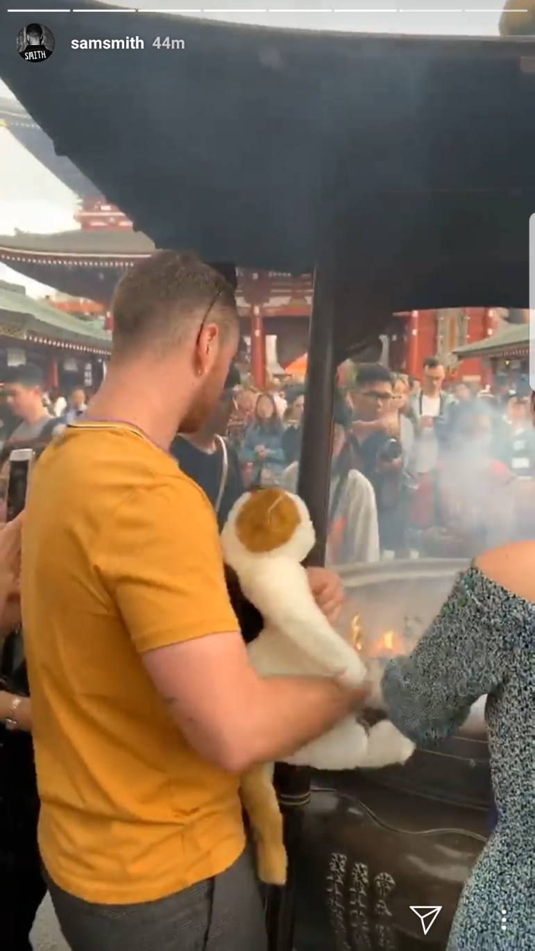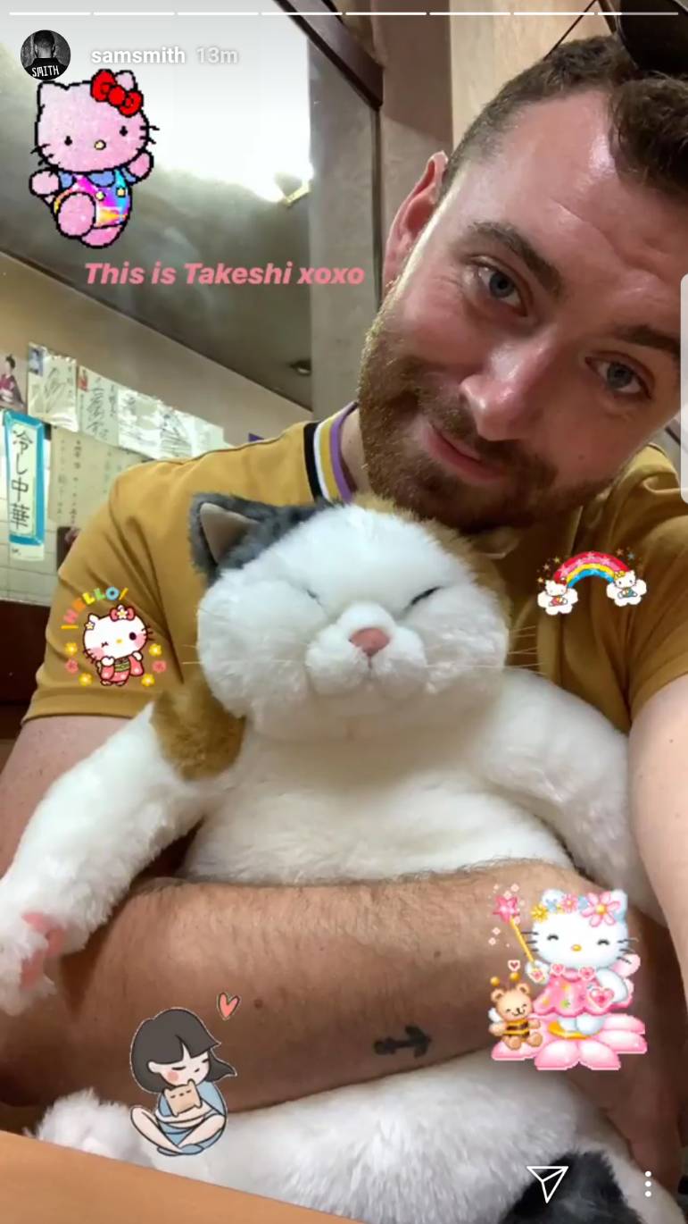 そんななか今年2回目となる日本を堪能中のサムが「タケシ」に出会った。その「タケシ」の正体は、ネコのぬいぐるみ。サムは大事そうにそのぬいぐるみを抱え、1,000万人以上いるインスタグラムのフォロワーに向け「この子はタケシだよ」と紹介。