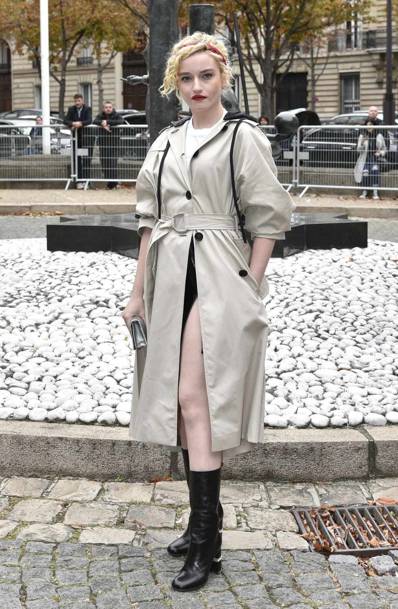 女優のジュリアは、ベージュのトレンチコートのフロントボタンを1つだけ留めてスリット・ドレスコート風に着こなして。袖はたくし上げて着なれた風にスタイリング。