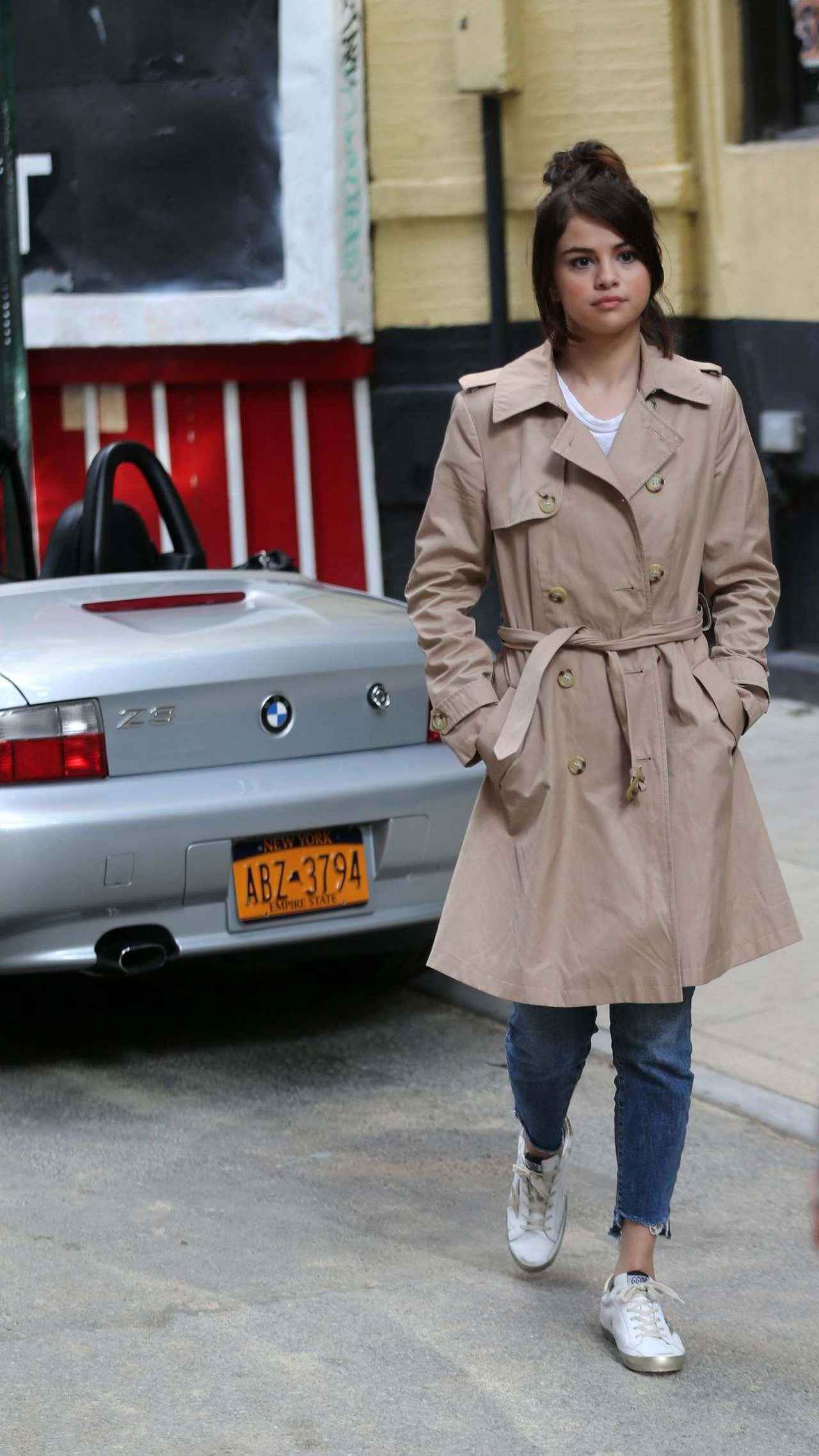 スタンダードなベージュのLauren Ralph Laurenのトレンチを着た セレーナ・ゴメスは、インナーには白Tシャツ、ボトムにはデニムを合わせ、Golden Gooseのダメージスニーカーでカジュアルなスタイルに。