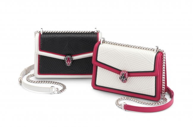鮮やかな光、色、モチーフを囲むように設置されたショーケースには、ブルガリのアイコン「セルペンティ」が遊び心溢れる世界観に溶け込み、ジュエリーの他、アクセサリーの限定モデルや新作のウォレットなどがディスプレイされている。