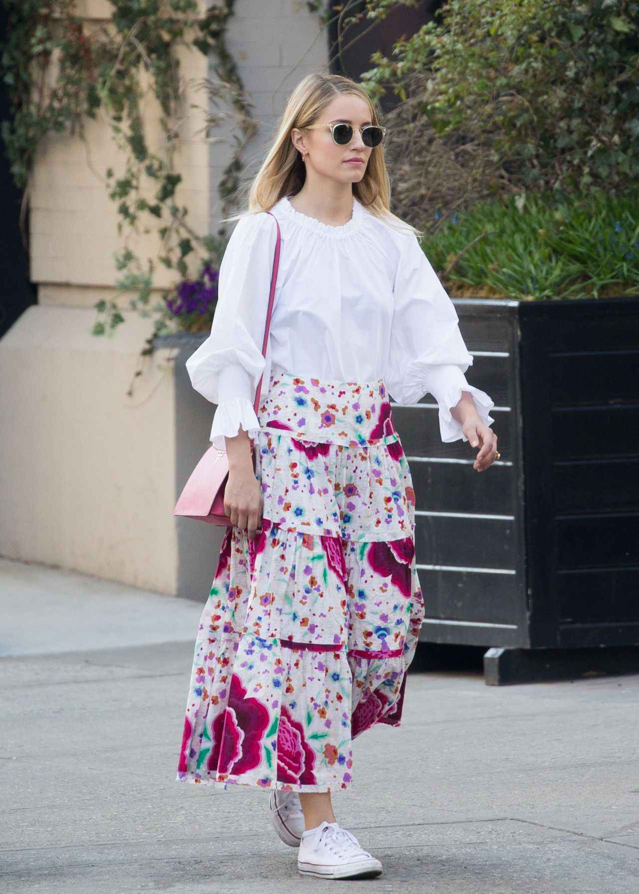 人気ドラマ『グリー』のディアナ・アグロンは、袖コンシャスなブラウスとフラワープリントのロングスカートを合わせたキュートなスタイルに、あえて白のConvers(コンバース)を合わせて、カジュアルダウン。