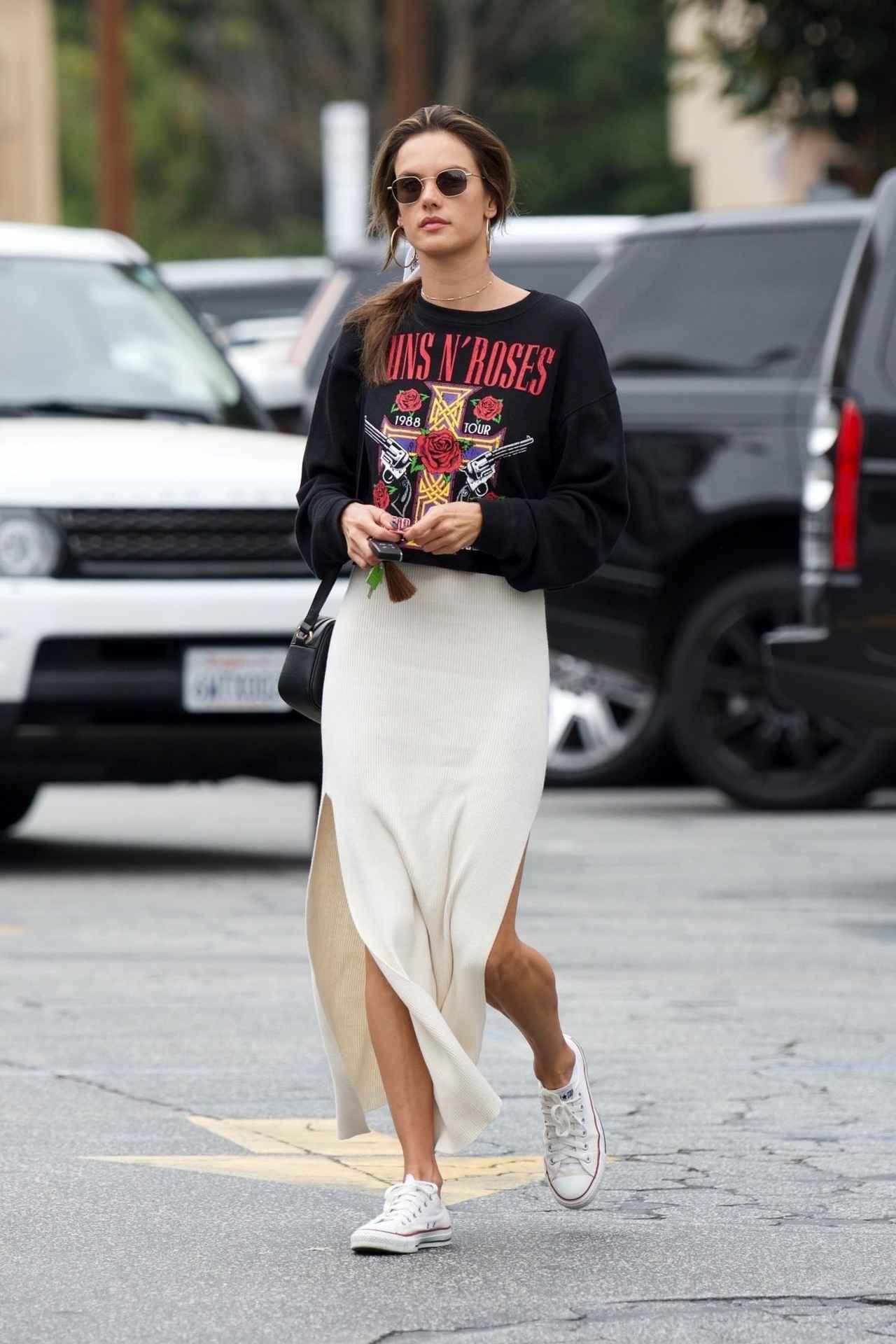 トップモデルのアレッサンドラ・アンブロジオは、ロックバンド、ガンズ・アンド・ローゼズのバンドTに、今年も注目の白のニットロングスカートを合わせ、Convers(コンバース)のスニーカーでスタイリングしたロックなスタイル。