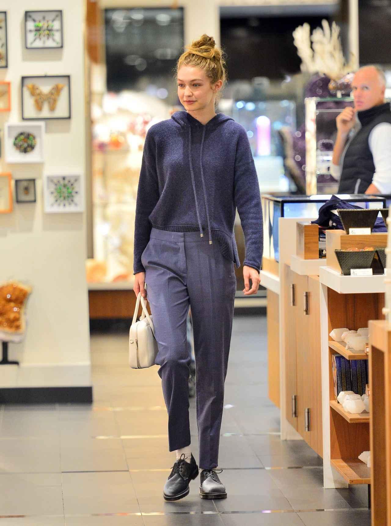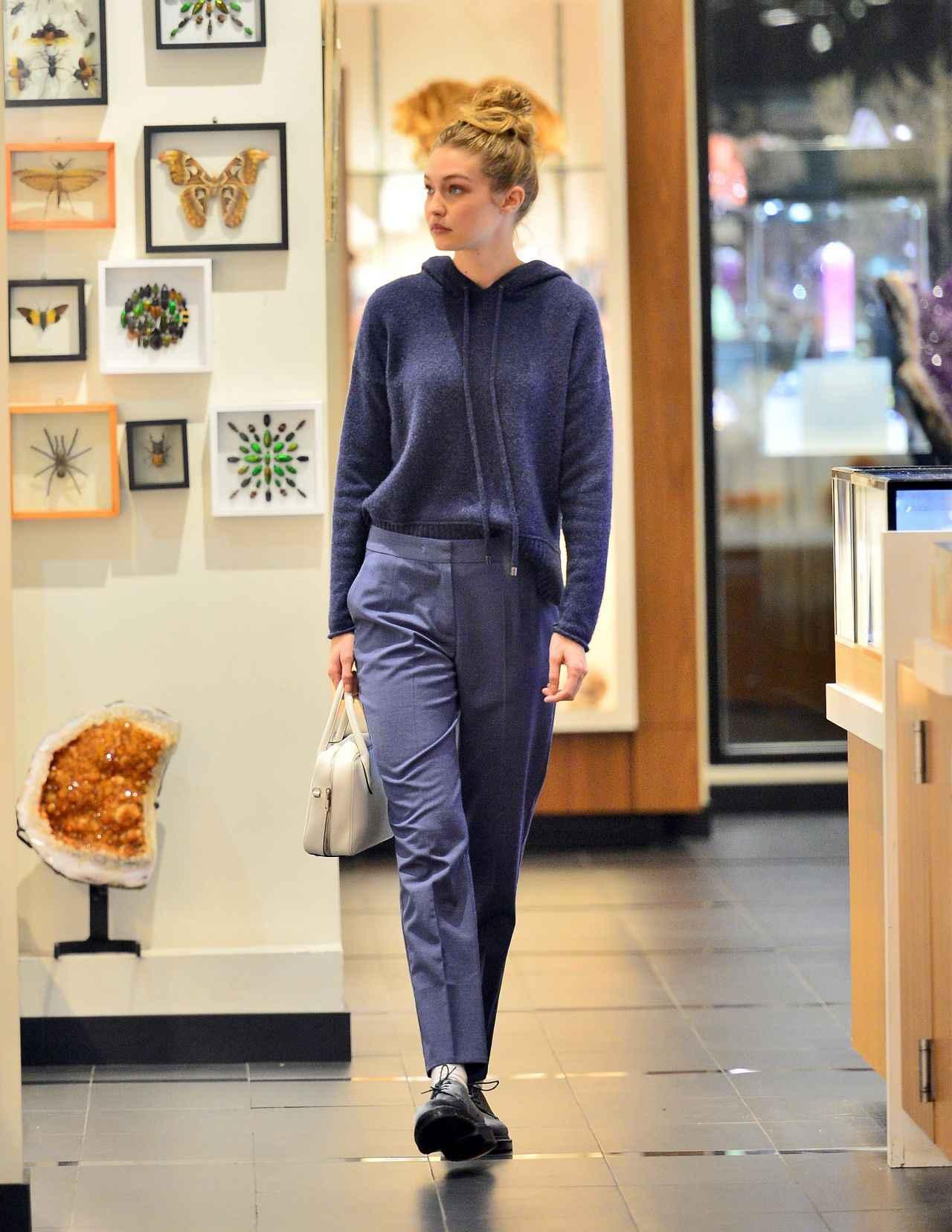 人気絶頂のトップモデル、ジジ・ハディッドは、ネイビーのニットフーディに、同じくネイビーのパンツを合わせたワントーンコーデで、ニューヨークのセレブ御用達デパート「バーグドルフ・グッドマン」へ。