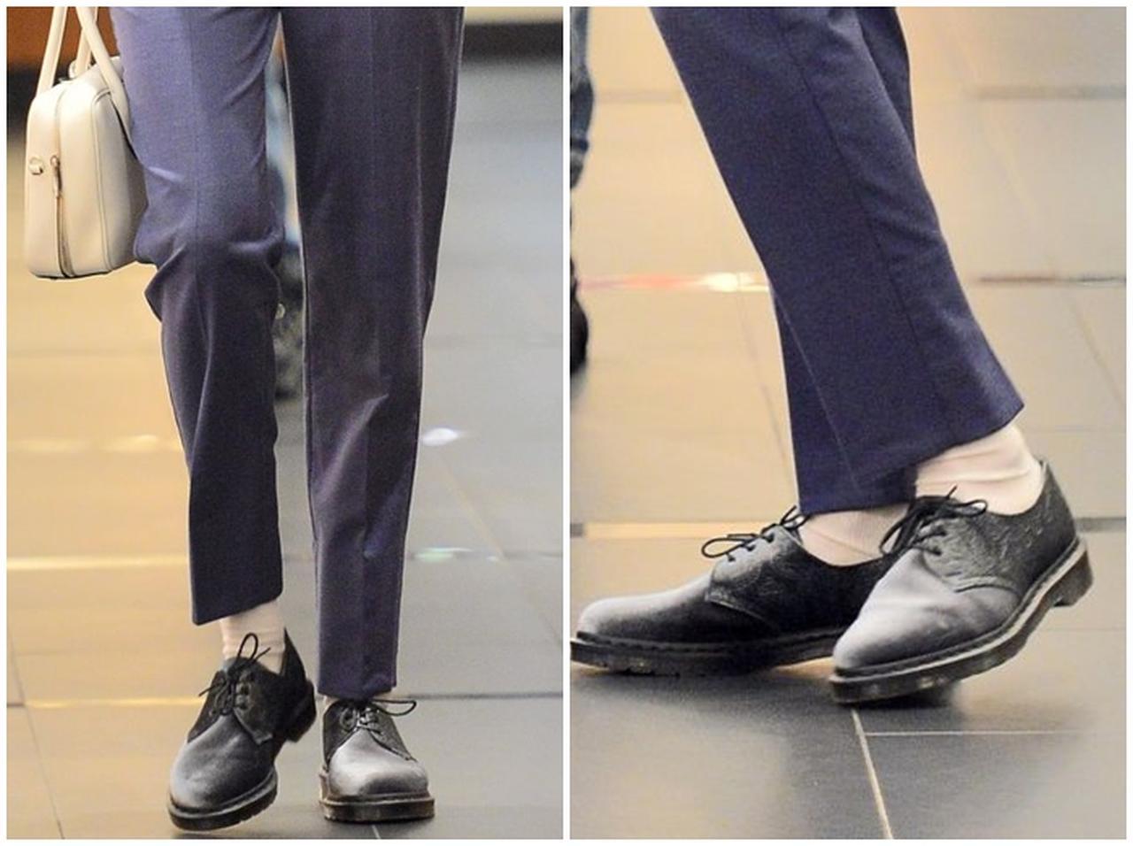 今季人気のタック入りのパンツに、Dr. Martens(ドクターマーチン)のオックスフォードシューズを合わせたマニッシュなルックは、足元に白ソックスを投入して、ダークトーンのスタイルに抜け感を作って。