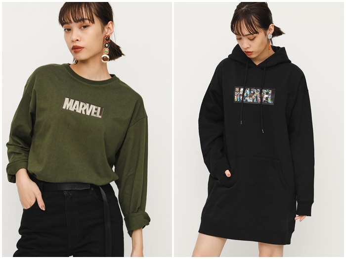 マーベルのロゴが描かれたアースカラーの長袖Tシャツやロング丈のパーカー、裏地にマーベルのコミックプリントが描かれたオーバーサイズのジャケットなどがラインナップ。
