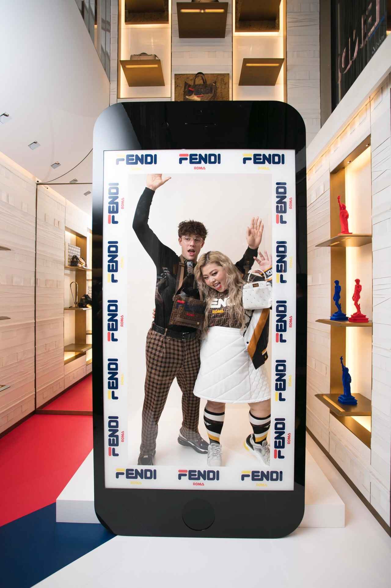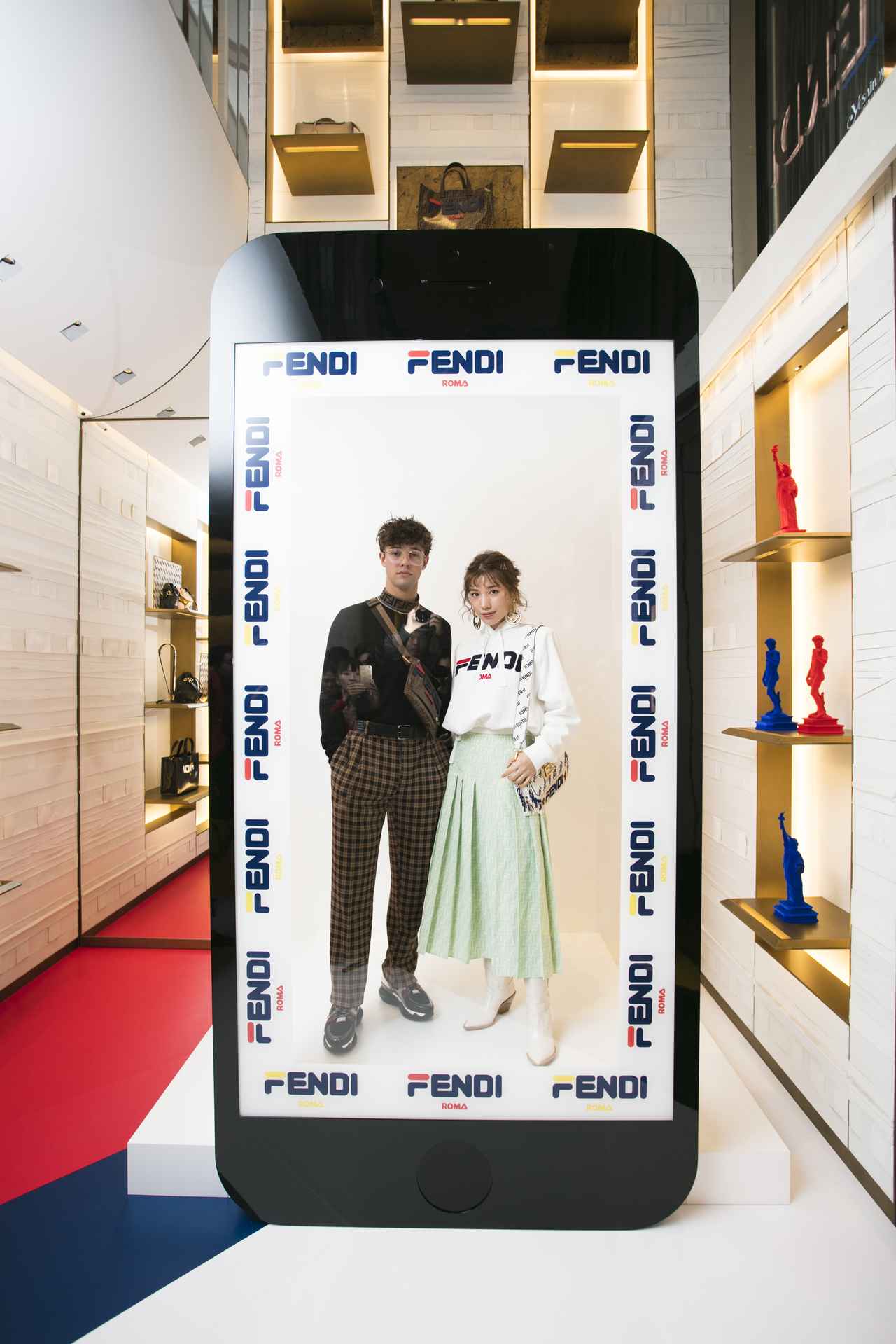とくに、カラフルなFENDI/FILA ロゴで縁取られた巨大なスマートフォンを模したフォトブースでのツーショット撮影に盛り上がっていた。