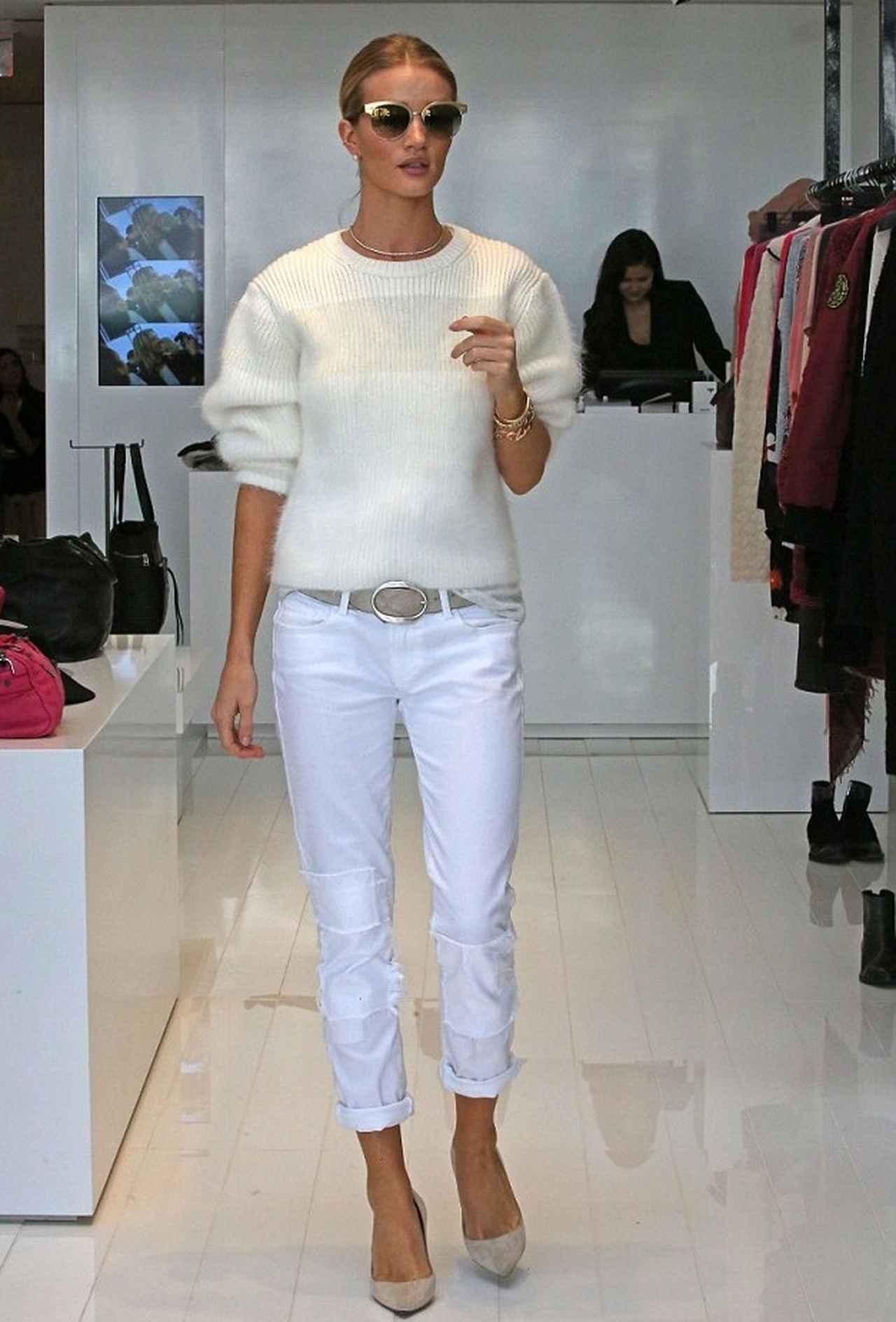 トップモデルのロージー・ハンティントン・ホワイトリーは、白のモヘア素材が柔らかい印象のニットに、ホワイトデニムを合わせた全身ホワイトコーデ。