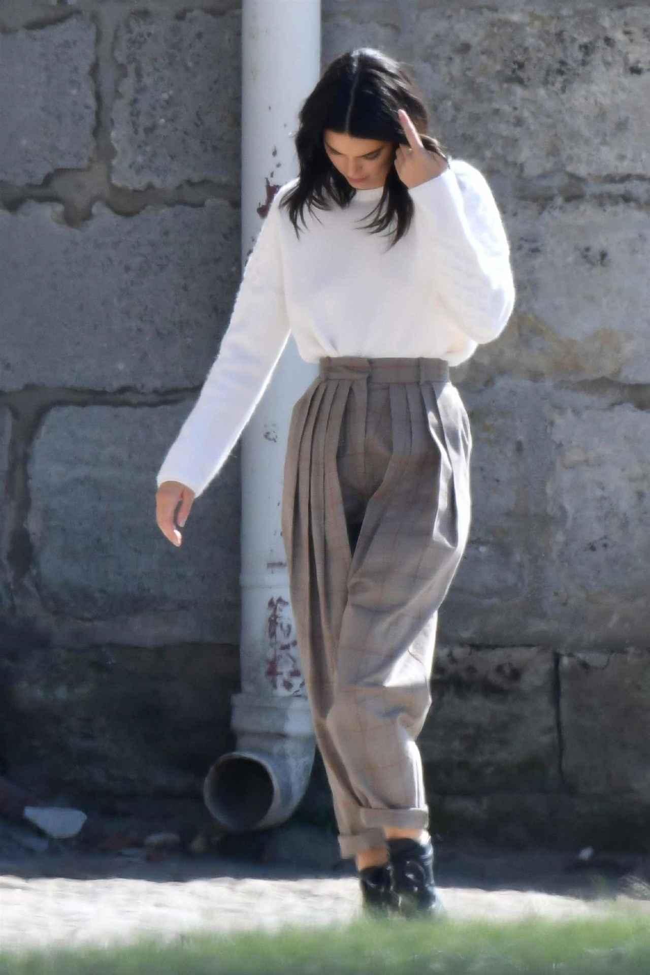 人気絶頂のモデル、ケンダル・ジェンナーは、シンプルな白ニットをタック入りのパンツにINしたカジュアルなコーデ。