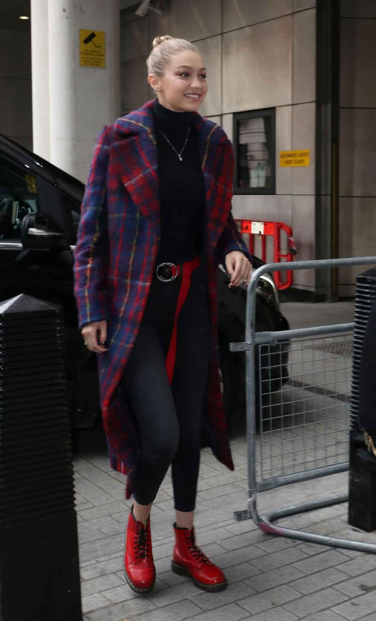 人気モデルのジジ・ハディッドは、Tommy Hilfiger(トミーヒルフィガー)のレッド×ネイビーのチェック柄コートに、Dr. Martens(ドクターマーチン)のレッドブーツを合わせたカラーコーデ。赤だけが浮かないように、ベルトにも赤を選んで全体にバランスをとって。
