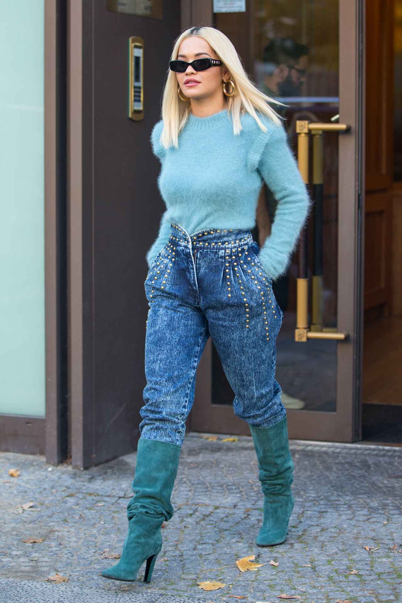ポップなスタイルがお得意なシンガーのリタ・オラは、ブルーのモヘアニットをスタッズがデザインされたデニムにINし、足元はグリーンのロングブーツでカラーコーディネート。