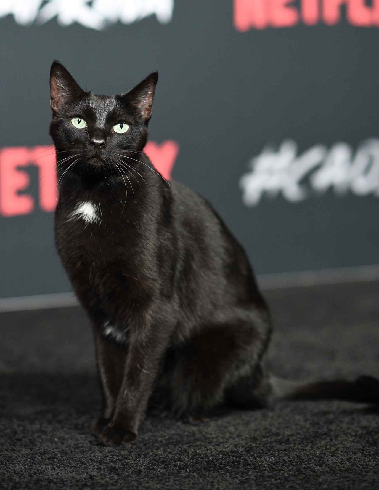 全部で5匹いるというセーレム役のうちの1匹だというこの黒猫は、レッドカーペットならぬブラックカーペットに集まった報道陣たちやカメラのフラッシュにも一切動じず、おすまし顔で貫禄の決めポーズ。