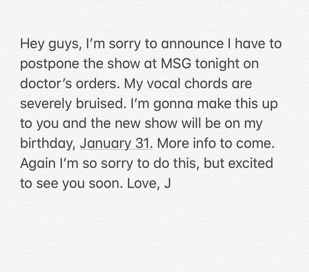 「みんな、申し訳ないが今夜の公演をドクターストップのため中止しなければいけない。僕の声帯が数ヵ所損傷しているんだ。埋め合わせの公演は僕の誕生日、1月31日を予定している。詳細はのちほど。こうしたことになってしまって改めて本当に申し訳ない。またすぐに会えることを楽しみにしているよ。愛をこめて、J」