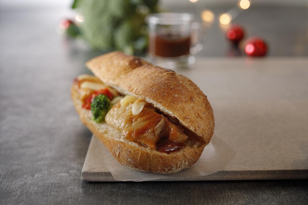 そして、ランチタイムにおすすめなのが、クリスマス感満載の『石窯フィローネホリデーチキン』。クリスマスの食卓を彩る一皿をイメージし、石窯で香ばしく焼き上げたサクサクのフィローネに、ジューシーなローストチキン、芳醇な味わいのマデラソース、マッシュポテト、チーズ、クリスマスらしい赤のピーマン、緑のブロッコリーをはさんだ。
