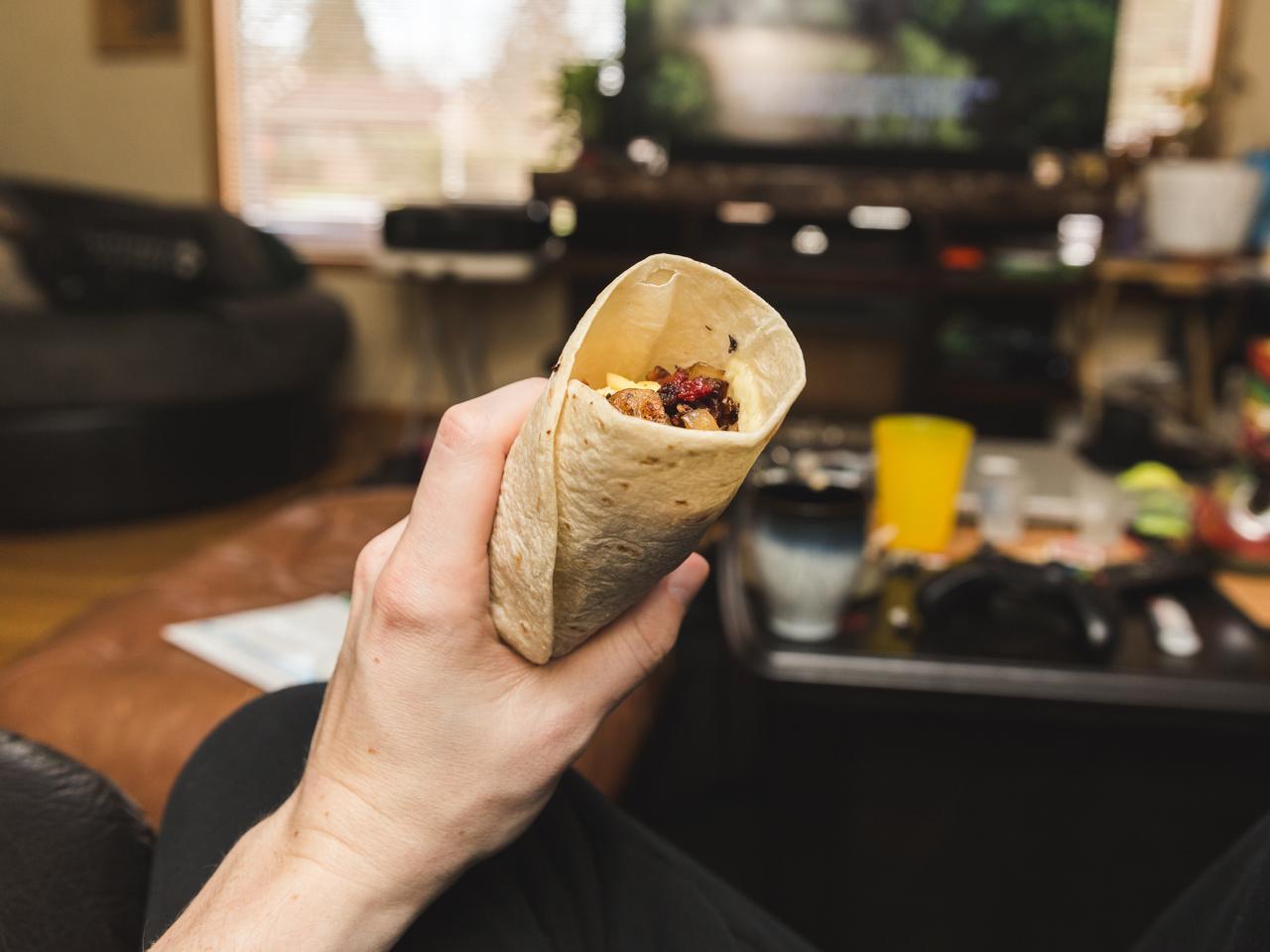 それがこの写真。そして注目すべきはブリトーの食べ方。