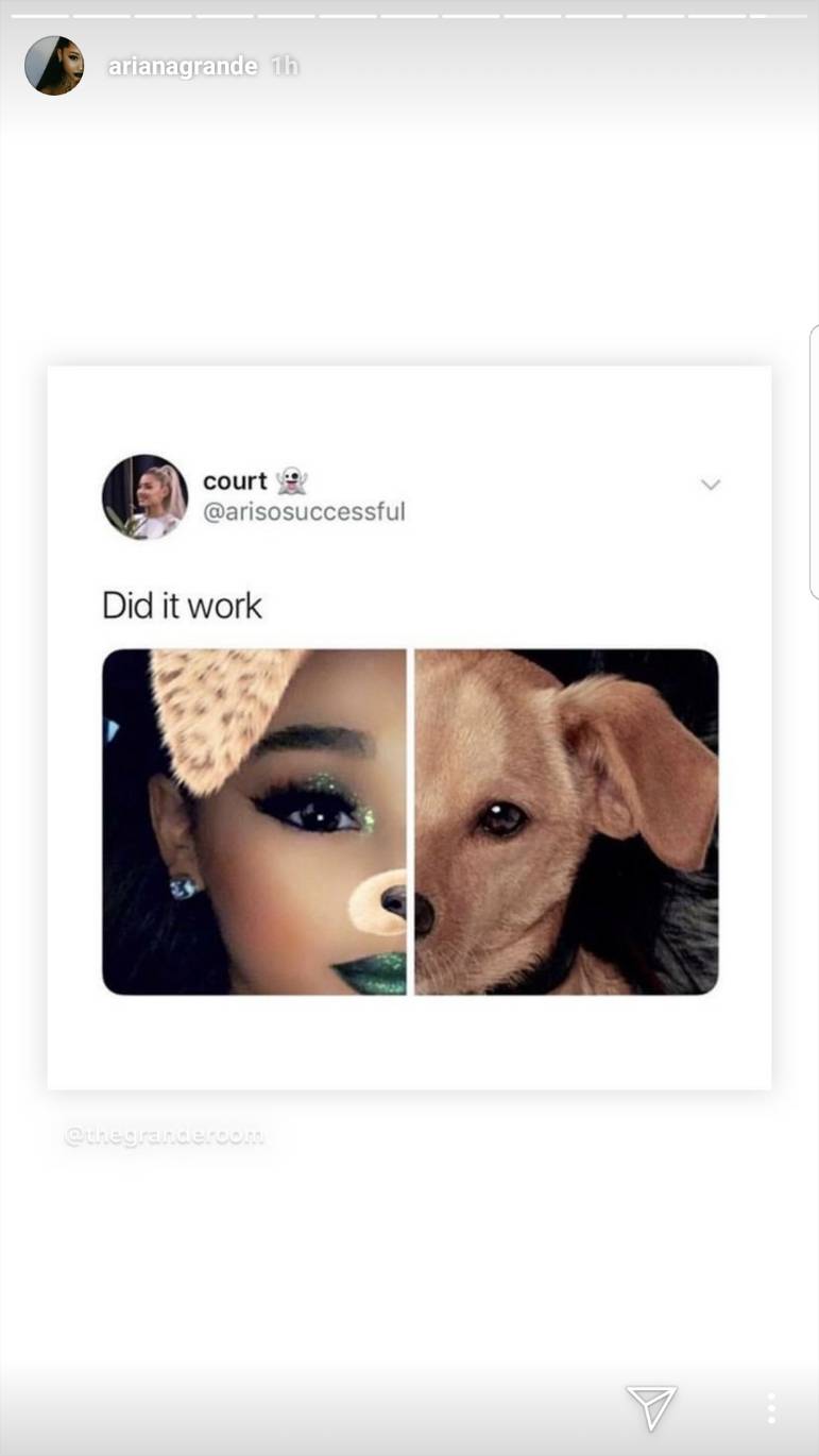 そんなアリアナが、愛してやまない愛犬トゥールーズと似ているという説が浮上。あるファンが、アリアナとトゥールーズの顔を半分に分けて一体化させたような写真を投稿。するとこの写真をアリアナ本人が発見。そしてアリアナも気に入ったのか、その写真を自身のインスタグラムにアップしてファンにシェアした。