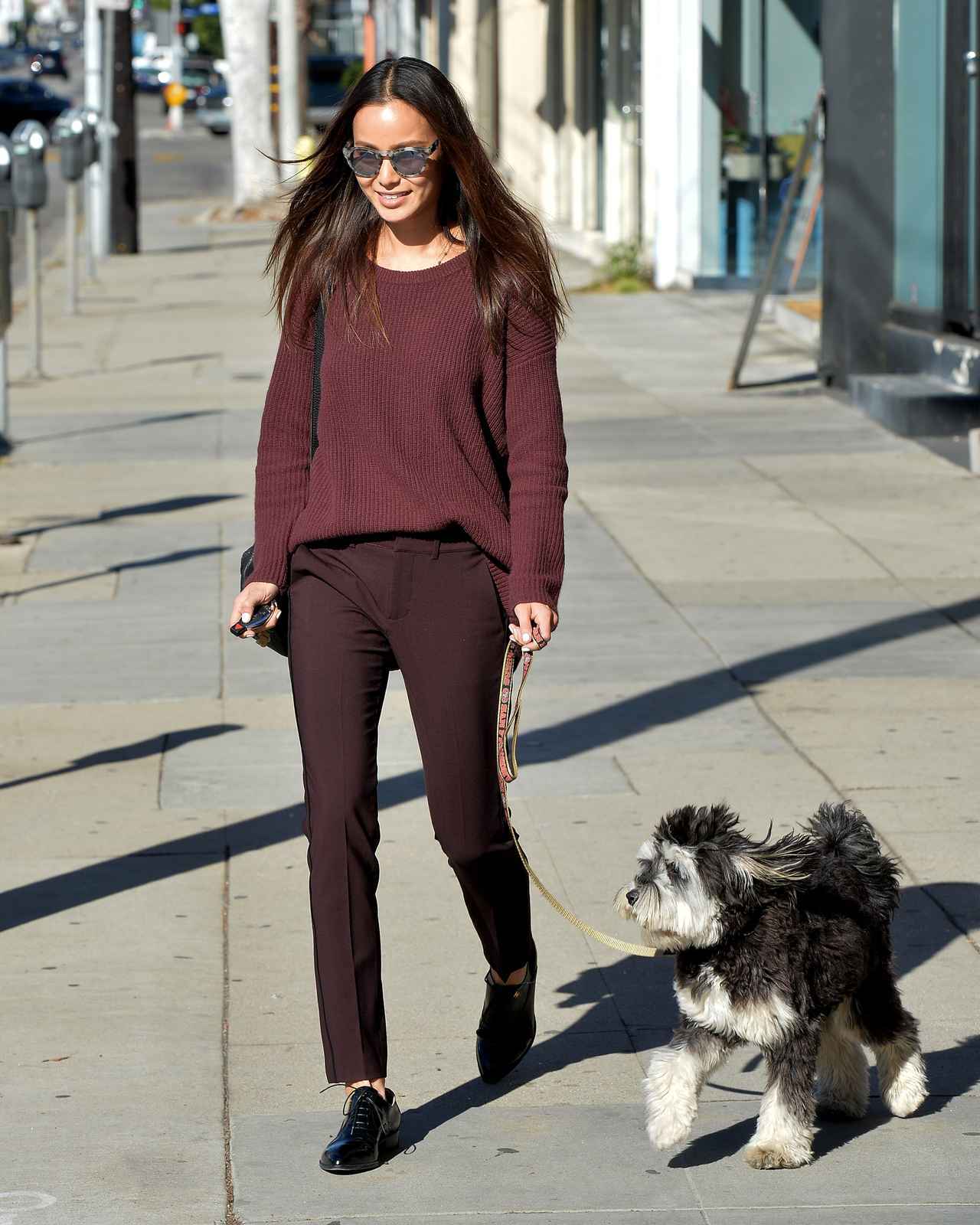 ハリウッドで活躍する人気アジア系女優のジェイミー・チャンは、明るめのボルドーのニットに、深めのボルドーのパンツを合わせたワントーンコーデで愛犬の散歩へ。