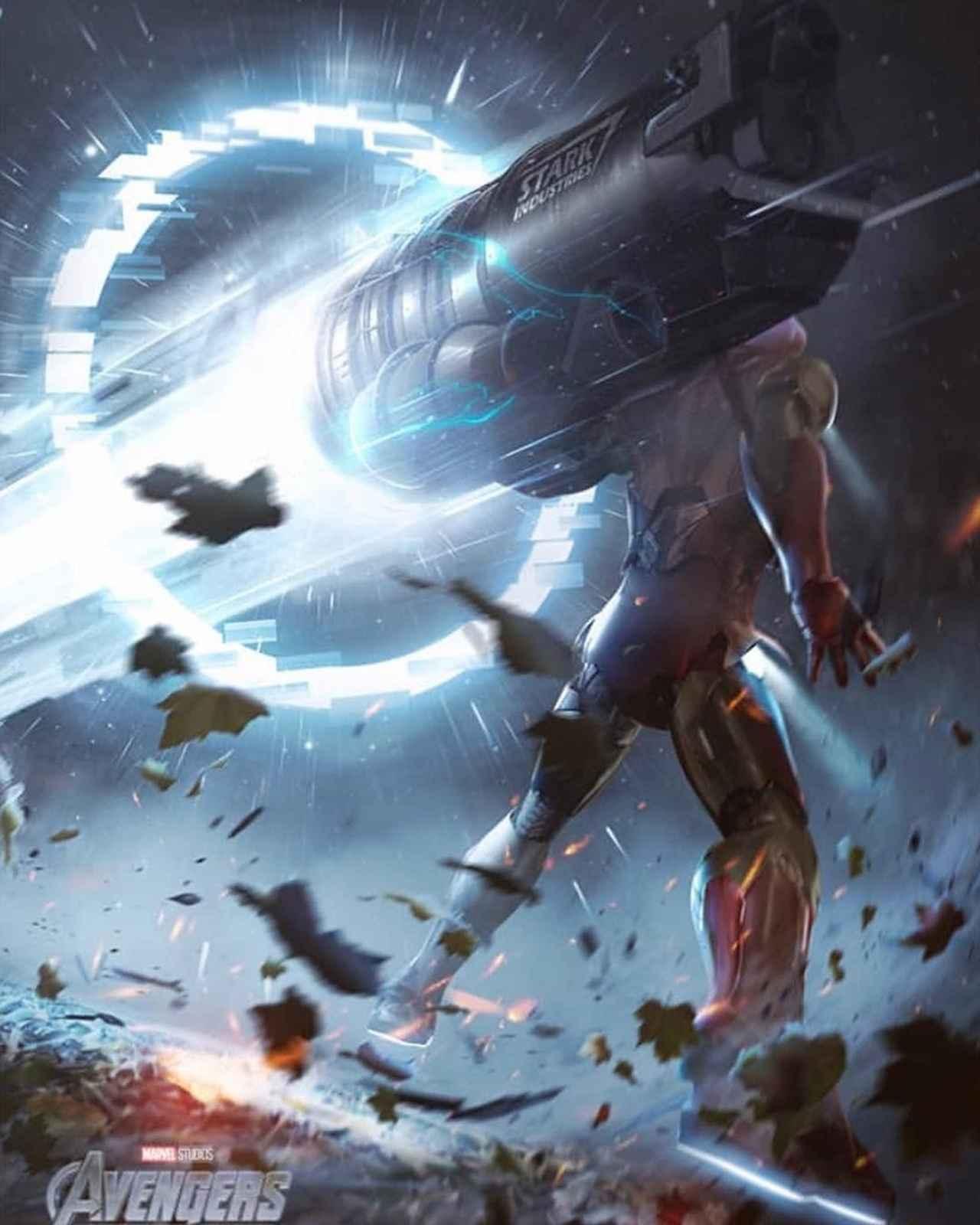 アイアンマンが自身の企業スターク社のロケットを抱えて青い光を発するビームを放っている画像は、ルッソ監督が公開したロケットと青い光がリンクする。
