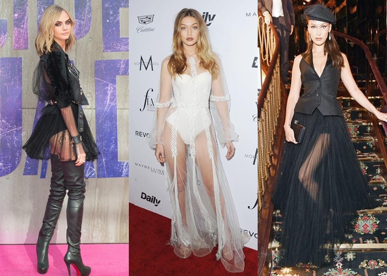 左から:女優のカーラ・デルヴィーニュ、モデルのジジ・ハディッド、ベラ・ハディッド。