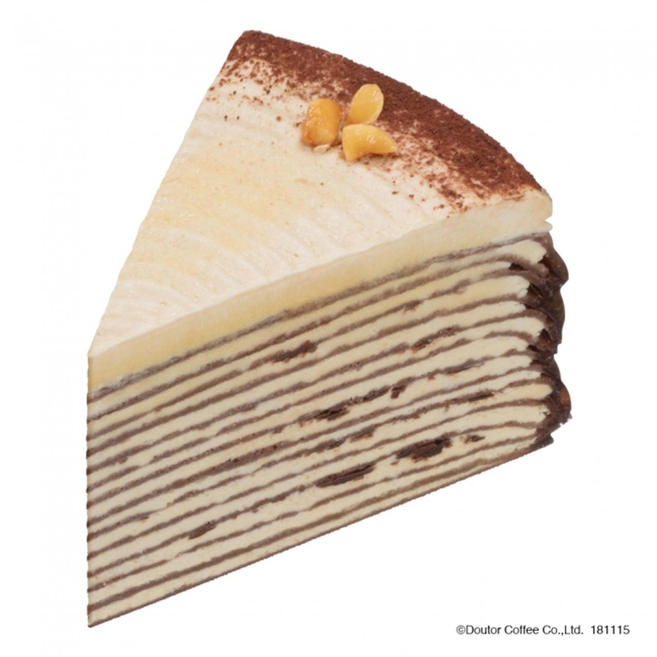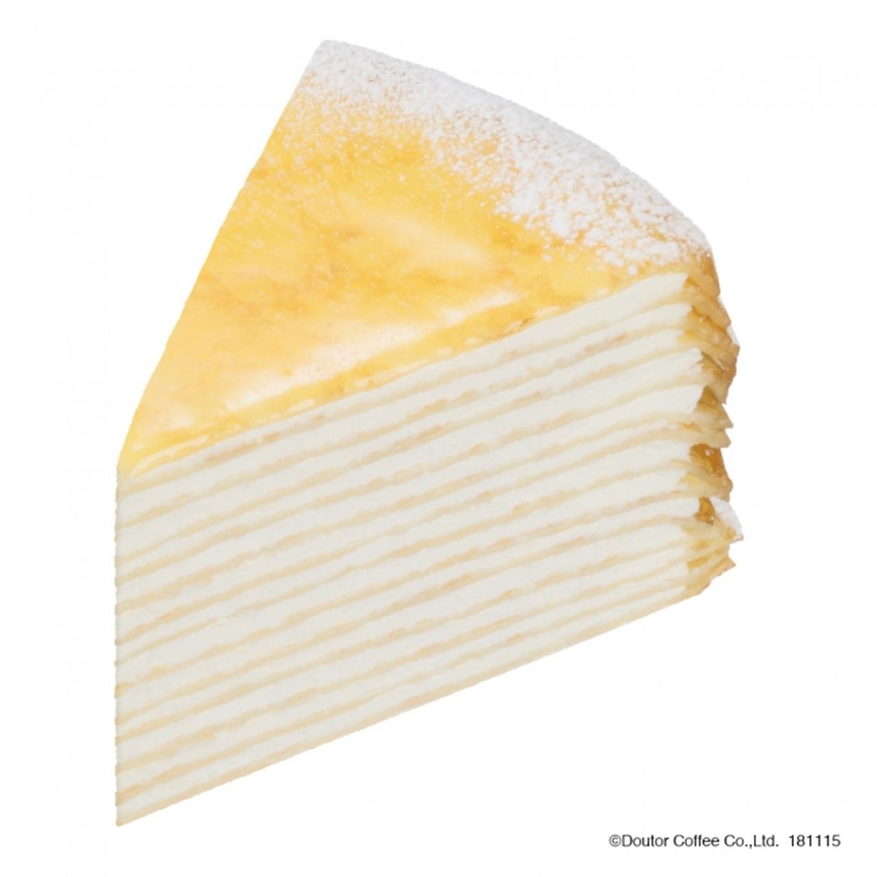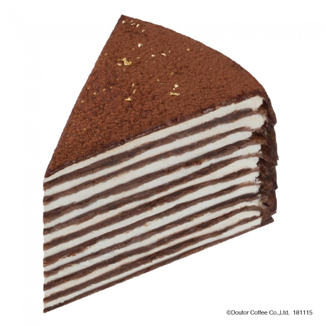 一枚一枚丹念に薄く焼き上げたクレープ生地とホイップクリームを丁寧に重ねた、なめらかな口どけのケーキです。表面は、香ばしいカラメル風味のナパージュをかけ、仕上げに粉雪を連想させる粉糖をトッピング。ドトールコーヒーショップ定番人気の味わい。