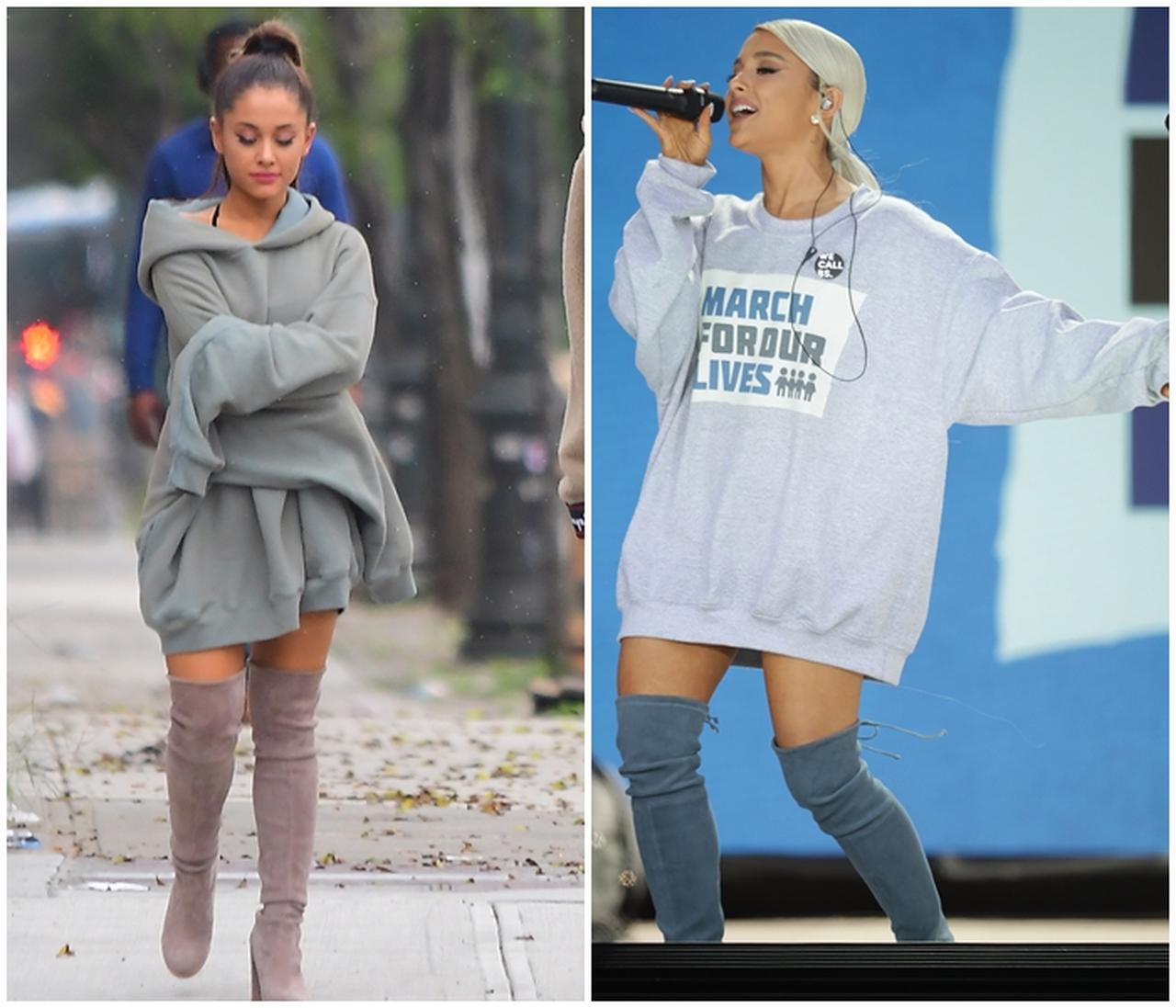世界中で注目された、銃規制を求める大規模デモ「マーチ・フォー・アワ・ライヴス」でのパフォーマンスに出演した時のアリアナは、同イベントのスウェットにスチュアート・ワイツマンのニーハイブーツを合わせた、グレイッシュなコーデがスタイリッシュだと話題に。