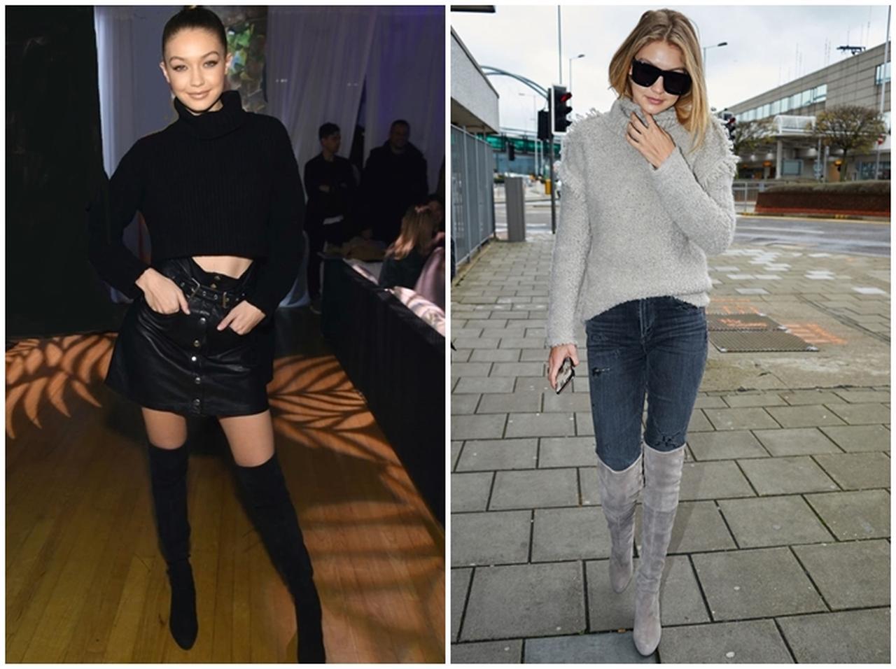 トップモデルのジジ・ハディッドは、スチュアート・ワイツマンのブラックとグレーのニーハイブーツをスタイルによって履き分けて愛用。