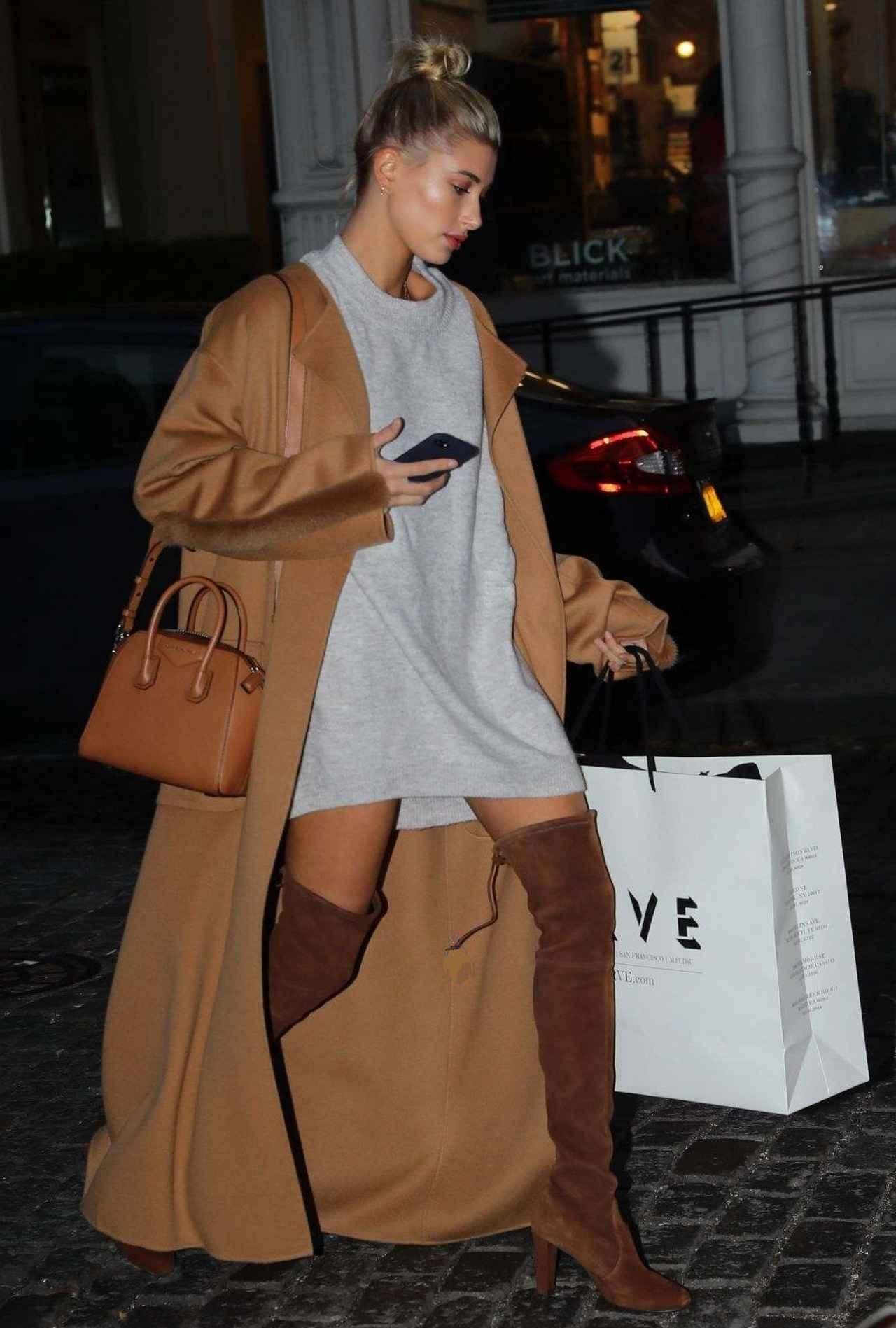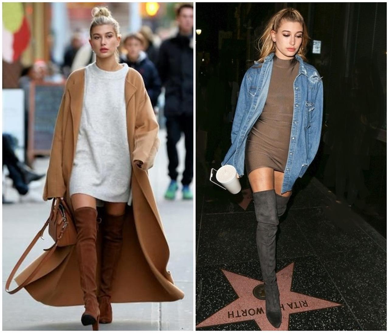 話題のモデル、ヘイリー・ボールドウィンはブラウンとグレーのニーハイブーツを愛用