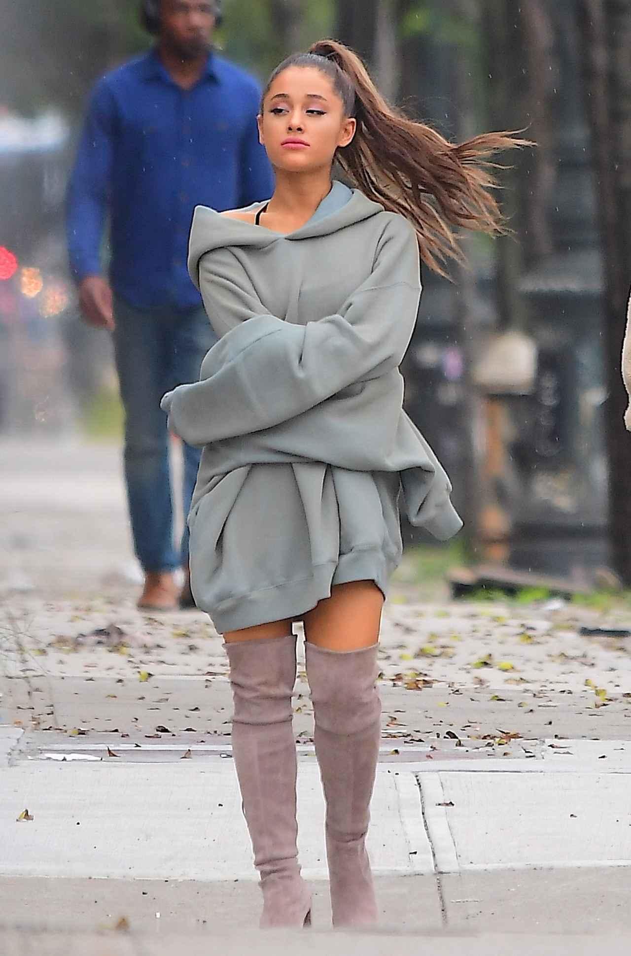最近のアリアナの定番スタイルといえば、ビッグシルエットのスウェット+ニーハイブーツ! 今では世界中のファンたちがマネしてしてしまうほど、アイコニックなアリアナルックのカギは、スチュアート・ワイツマンのニーハイブーツ。
