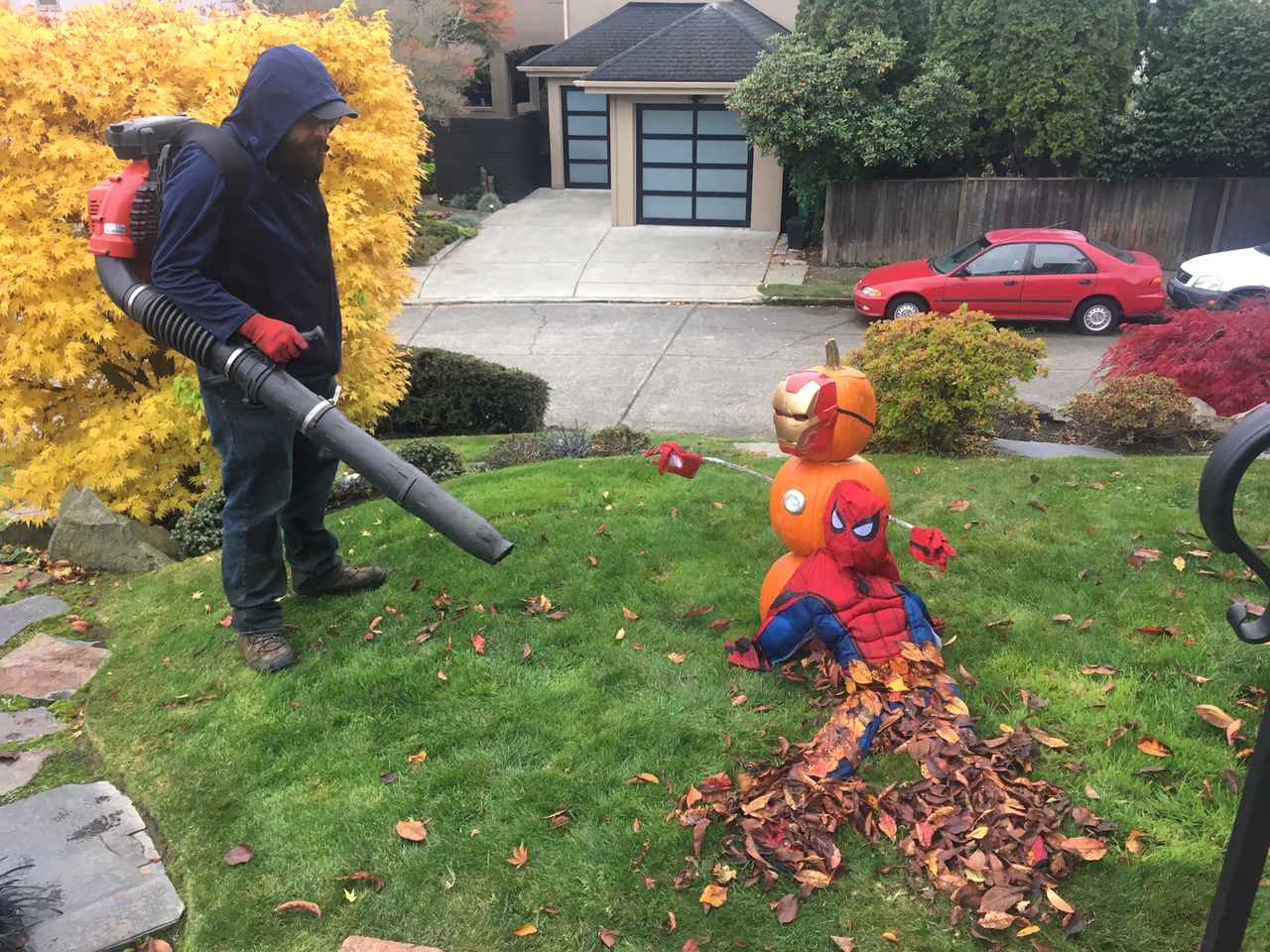 ロバートが投稿した写真で描かれたアイアンマンとスパイダーマンの図は、じつはファンによって作られたもののよう。カボチャのアイアンマンに寄りかかるスパイダーマンは、最終的に、落ち葉を吹き散らすことができるエンジンブロワーによって、跡形もなく吹き散らされてしまった。