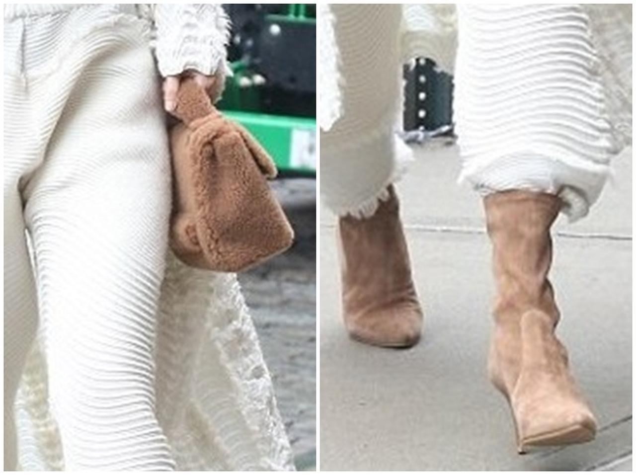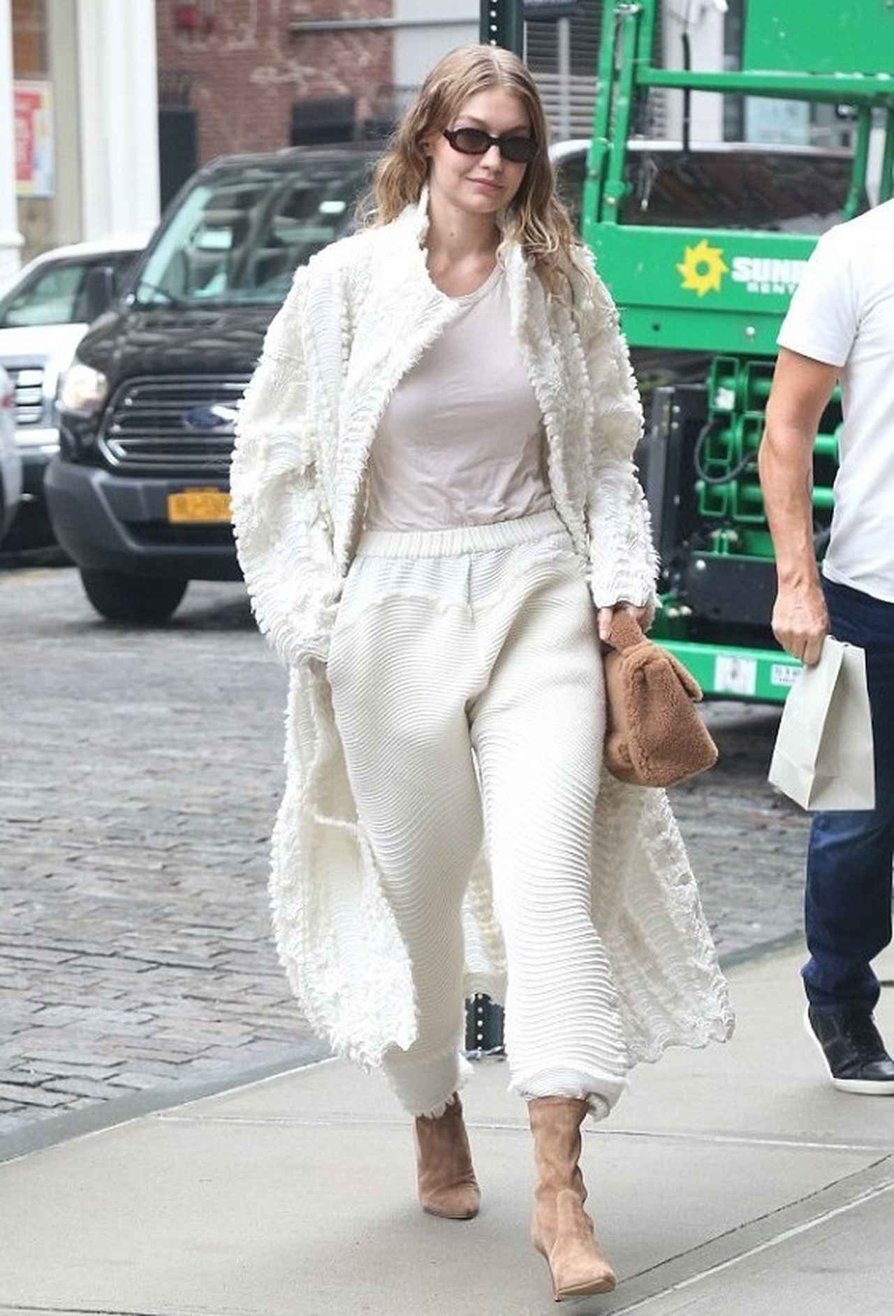 モデルのジジ・ハディッドは、白T、コート、パンツでスタイリングしたホワイトコーデに、ベージュのバッグとブーツを差し色にしてソフトな印象を作って。