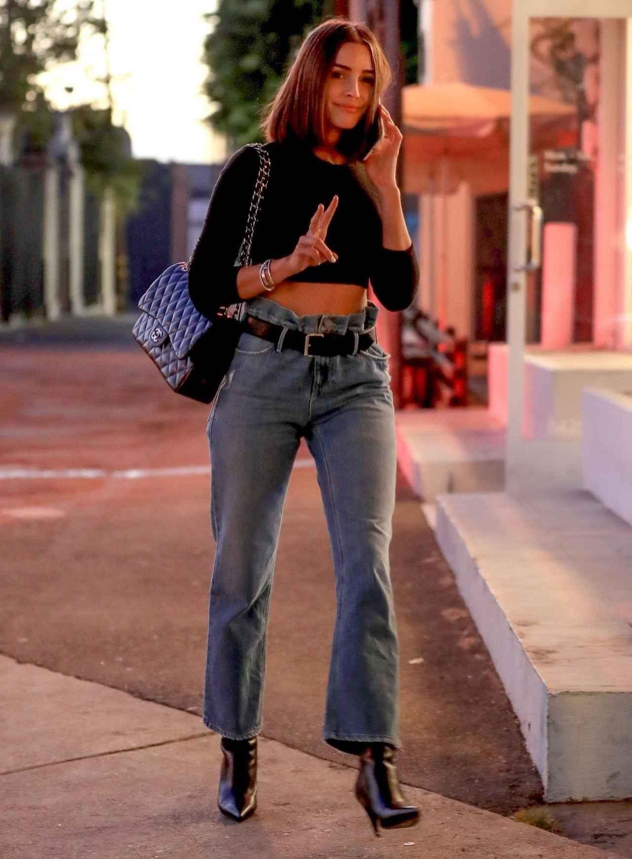 モデルのオリヴィア・カルポは、ウエスト部分がデザインされた旬なストレートデニムに、ショート丈のニットを合わせたモデルらしい着こなし。