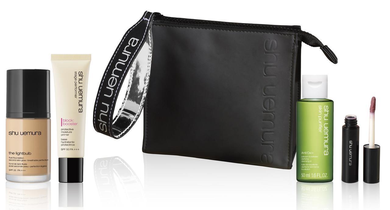 シュウ ウエムラのファンデーションとメイクアップベースを1品ずつ購入すると、A/O+ P.M.クリア ユースラディアント クレンジング オイル50ml、ラック シュプリア BG 04のミニサイズのほか、アスレジャーなデザインがオシャレなポーチがついてくるので、ぜひチェックしてみて。