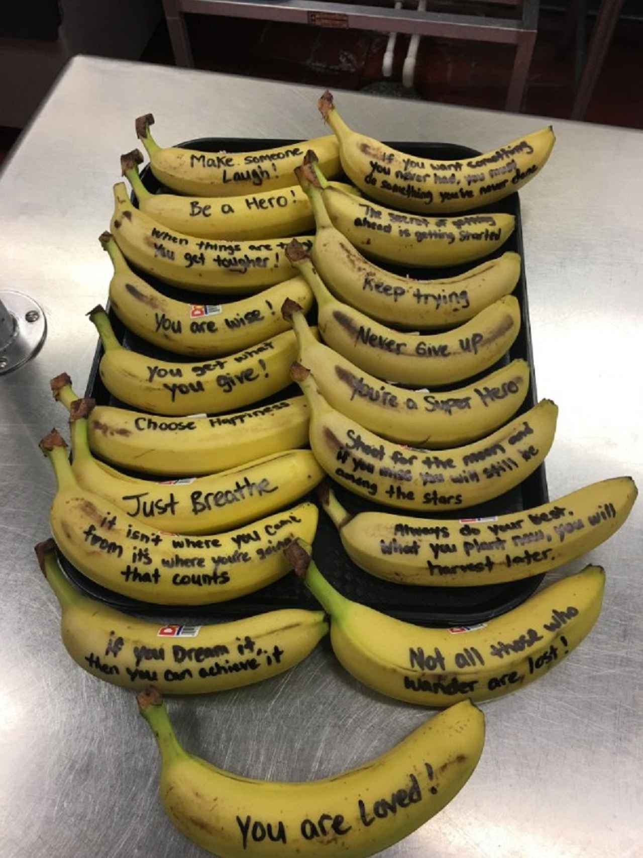 ステイシーは「Be kind(人に優しく)」、「You are loved(あなたは愛されている)」、「If you dream it, then you can achieve it(夢見ることができるなら、きっとその夢は叶えられる)」、「Be the reason someone smiles(誰かの笑顔の理由になろう)」、「Your future is bright(君の未来は明るい)」と言った心が励まされるような格言をバナナ1本1本にマジックで書き、子供たちに配ることに。