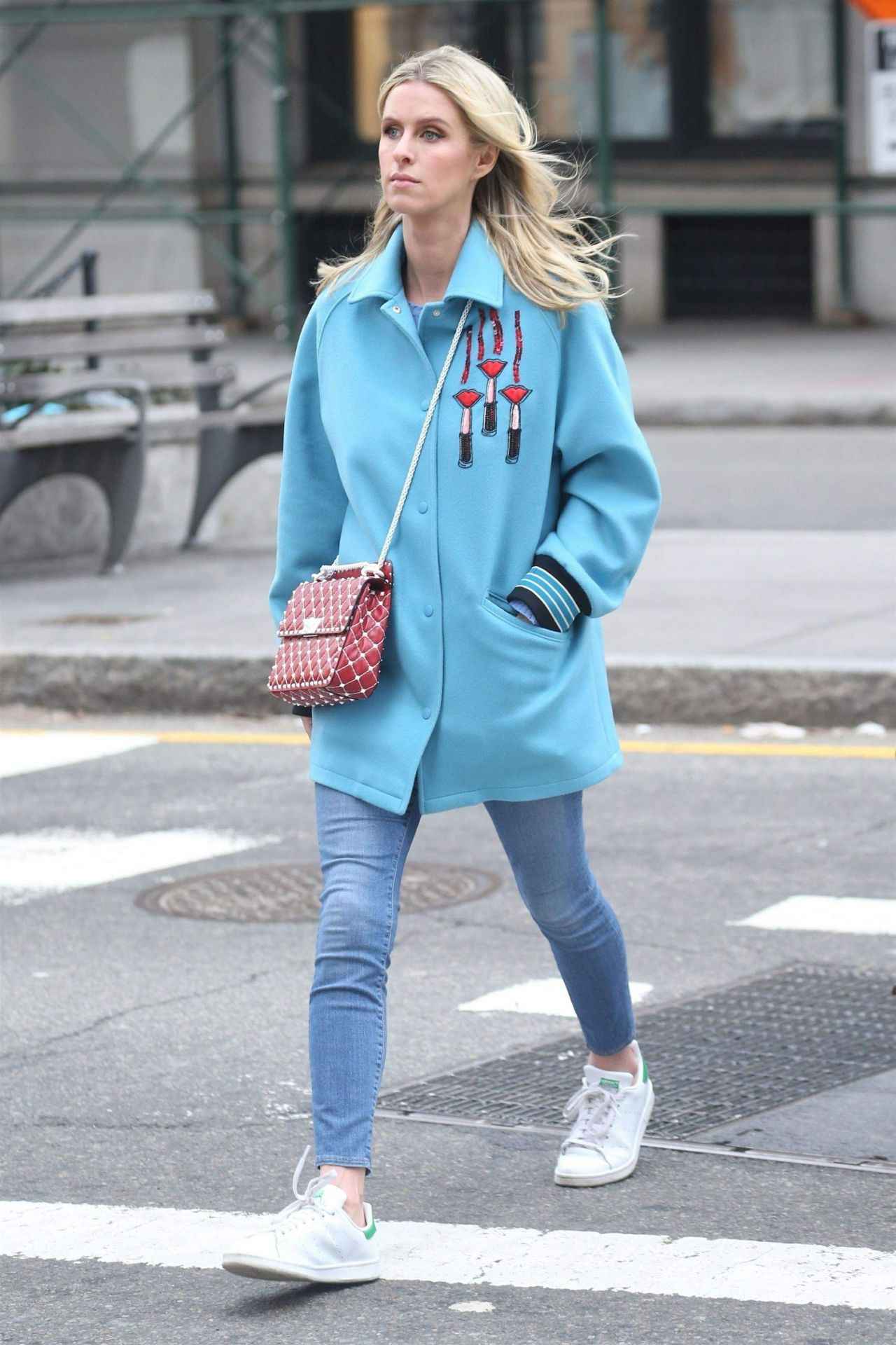 ポップなデザインがキュートなValentino(ヴァレンティノ)のコートとバッグをデニムでカジュアルダウンさせ、足元はAdidas(アディダス)のスタン・スミスで抜け感をつくったニッキー・ヒルトン。