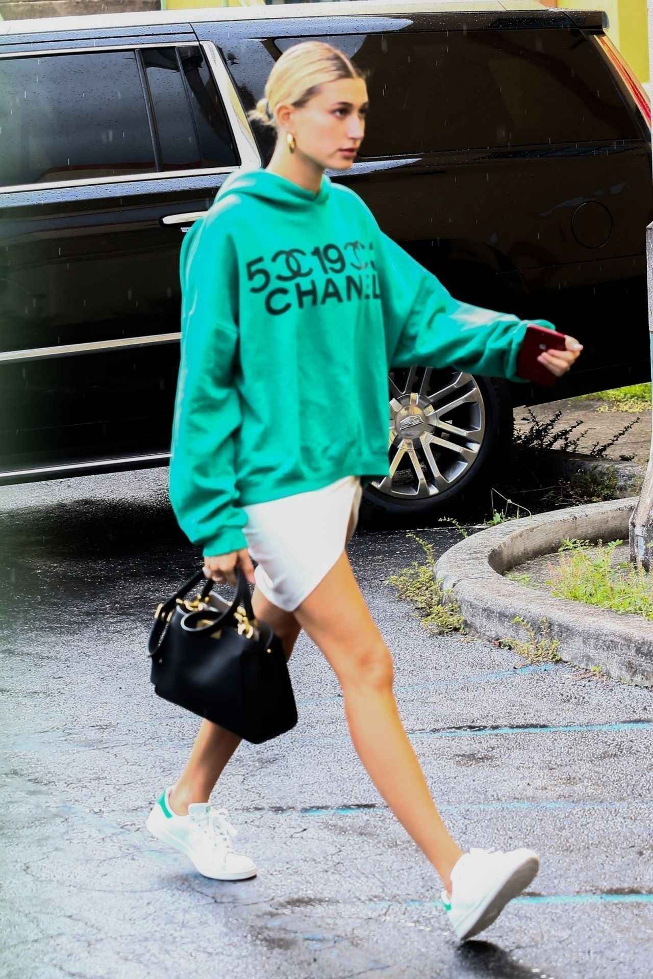 モデルのヘイリー・ボールドウィンは、Meshkiのスリップ風ワンピースにフーディを重ねた旬なミックスコーデに、Adidas(アディダス)のスタン・スミスでスポーティに仕上げて。