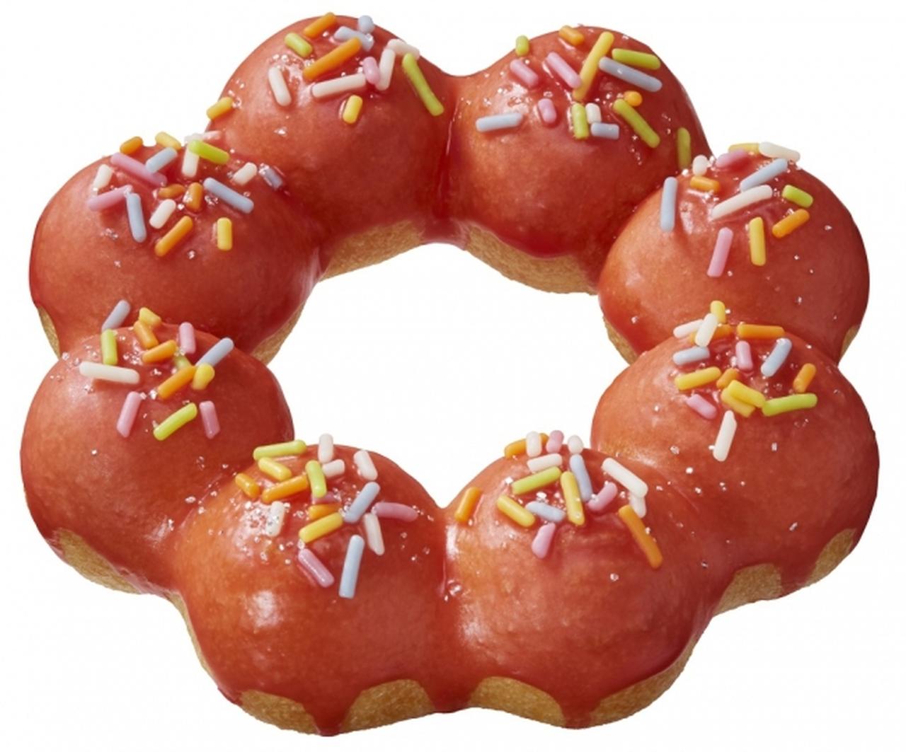 もちもち食感のポン・デ・リング生地に、ストロベリーチョコを線がけし、色鮮やかなカラースプレーをふりかけた。