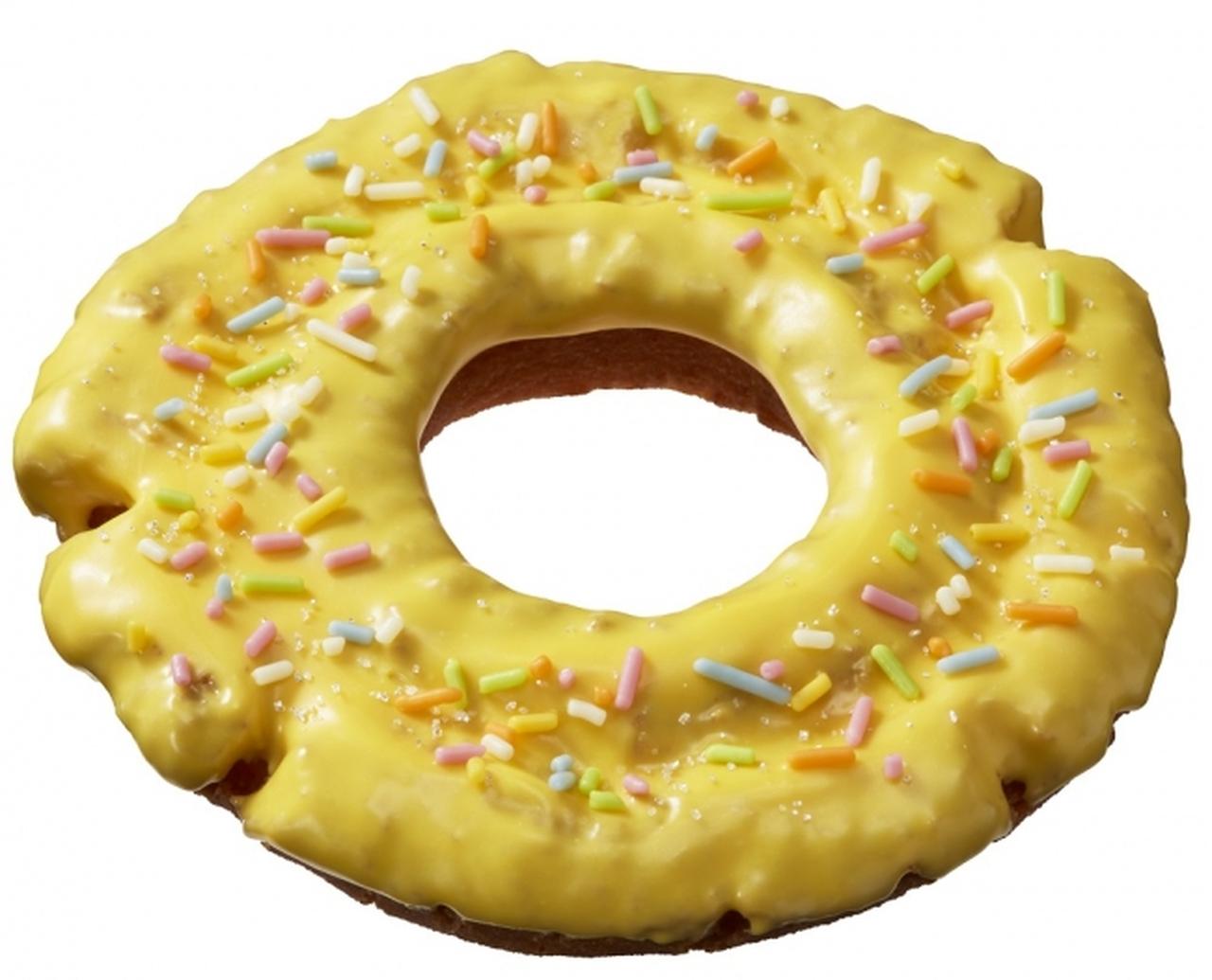 サクサク食感のオールドファッション生地にバナナ風味のチョコでコーティングし、色鮮やかなカラースプレーと銀箔シュガーをトッピング。